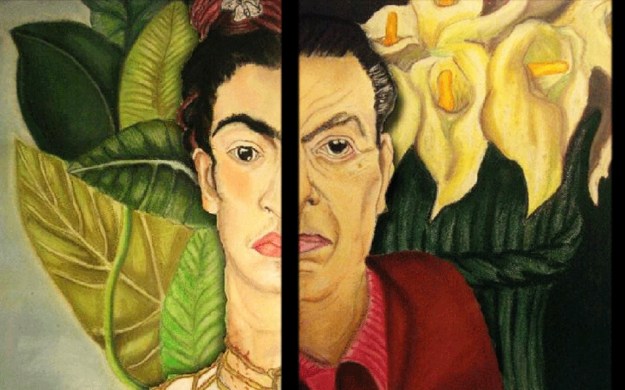 Un géant jouisseur, peintre de fresques démesurées aux multiples personnages colorés et une petite femme cassée par un accident d’autobus alors qu’elle avait dix-huit ans, portant corset, souvent condamnée à rester au lit où elle peignait de petits format de fleurs, des autoportraits, des légumes…