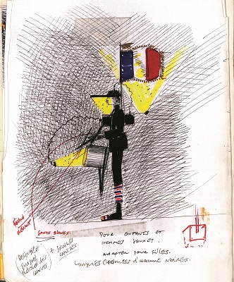 Ce passage du graphisme au modèle vivant est d’ailleurs particulièrement intéressant. On y voit que le corps ne se laisse pas facilement transformer. Il n’est pas la simple adaptation d’une représentation en deux dimensions. Il résiste et nécessite une réappropriation qui fait que certains de ses dessins-collages sont assez éloignés de la photographie finale.