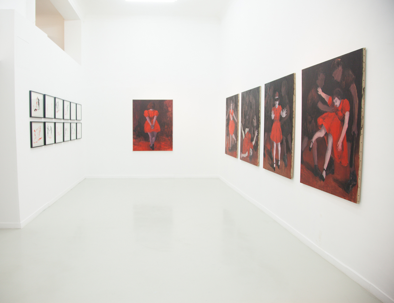 Après ses séries sur la Mythologie, sur les Guerriers, les Boxeurs, les Couples, etc., Jacqueline Gainon, dans cette nouvelle exposition chez Eva Vautier, nous raconte l’enfance, son enfance ? Pas toute l’enfance, seulement un jour, un après-midi, un court moment… où une petite fille de 8-10 ans à robe rouge est prise à partie par deux garçons un peu plus grands qu’elle. Elle est bousculée, attachée, les yeux bandées, renversée, mise à terre, etc., « comme dans un jeu qui pourrait mal tourner », nous dit l’artiste. Une série de tableaux de même format, parfaitement alignés, comme les instantanés d’une séquence. On est même tenté de remettre de l’ordre dans les images, mais c’est difficile d’en être sûr : les mains attachés précéderaient les yeux bandés ou l’inverse ?
