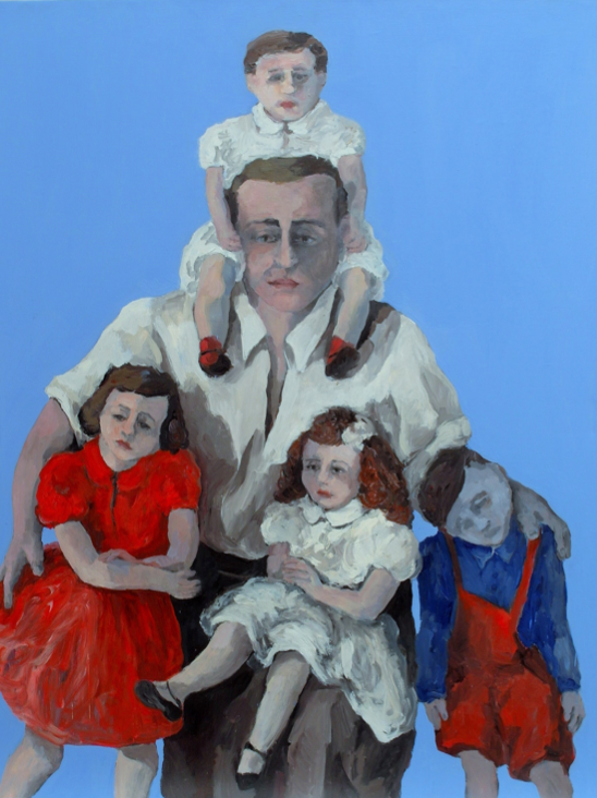 Pourtant, en entrant dans la galerie, les premières toiles de grand format très colorées présentent une famille souriante, posant comme pour une photo. La composition est pyramidale pour mieux signifier la stabilité, la « familiarité », mais les couleurs sont exagérées : fonds bleus transparents, robe d’un rouge intense, chemise bien bleue.