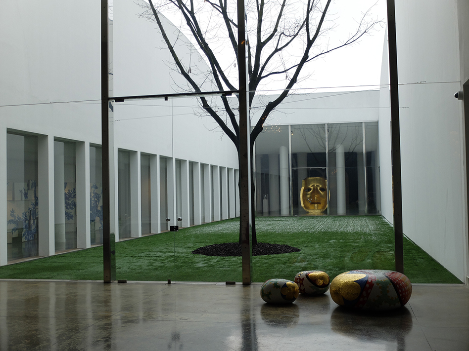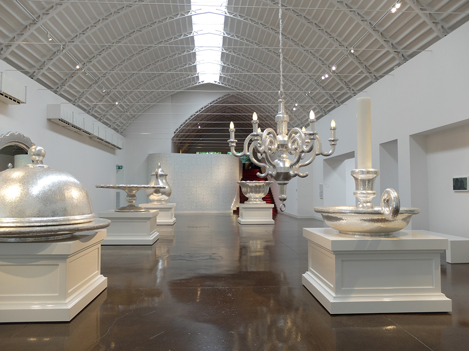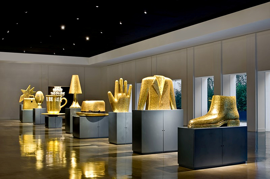 La visite du lieu offre des surprises, particulièrement les détournements d’objets du quotidien démesurément agrandis : mosaïques d’or blanc (théière, plat, bougeoir, miroir, cuillère, etc) du studio Job silver Ware (2007) avec son pendant de mosaïques d’or (chaussure, un gant, une veste, un chapeau, une étoile, etc.) de Alessandro Mendini.