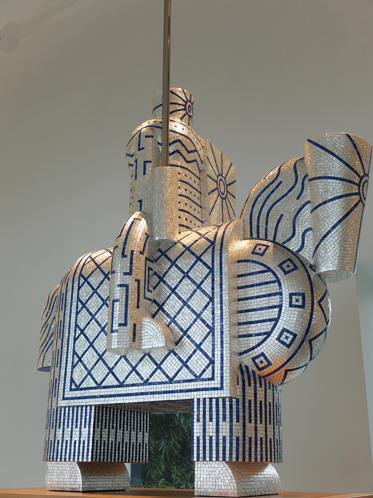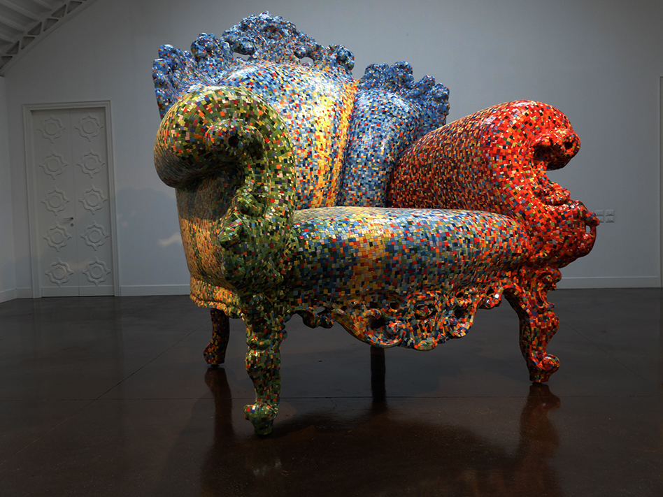 Changement d’échelle aussi pour le monumental Fauteuil de Proust d’Alessandro Mendini (2006), la plus connue des œuvres en mosaïque polychrome.