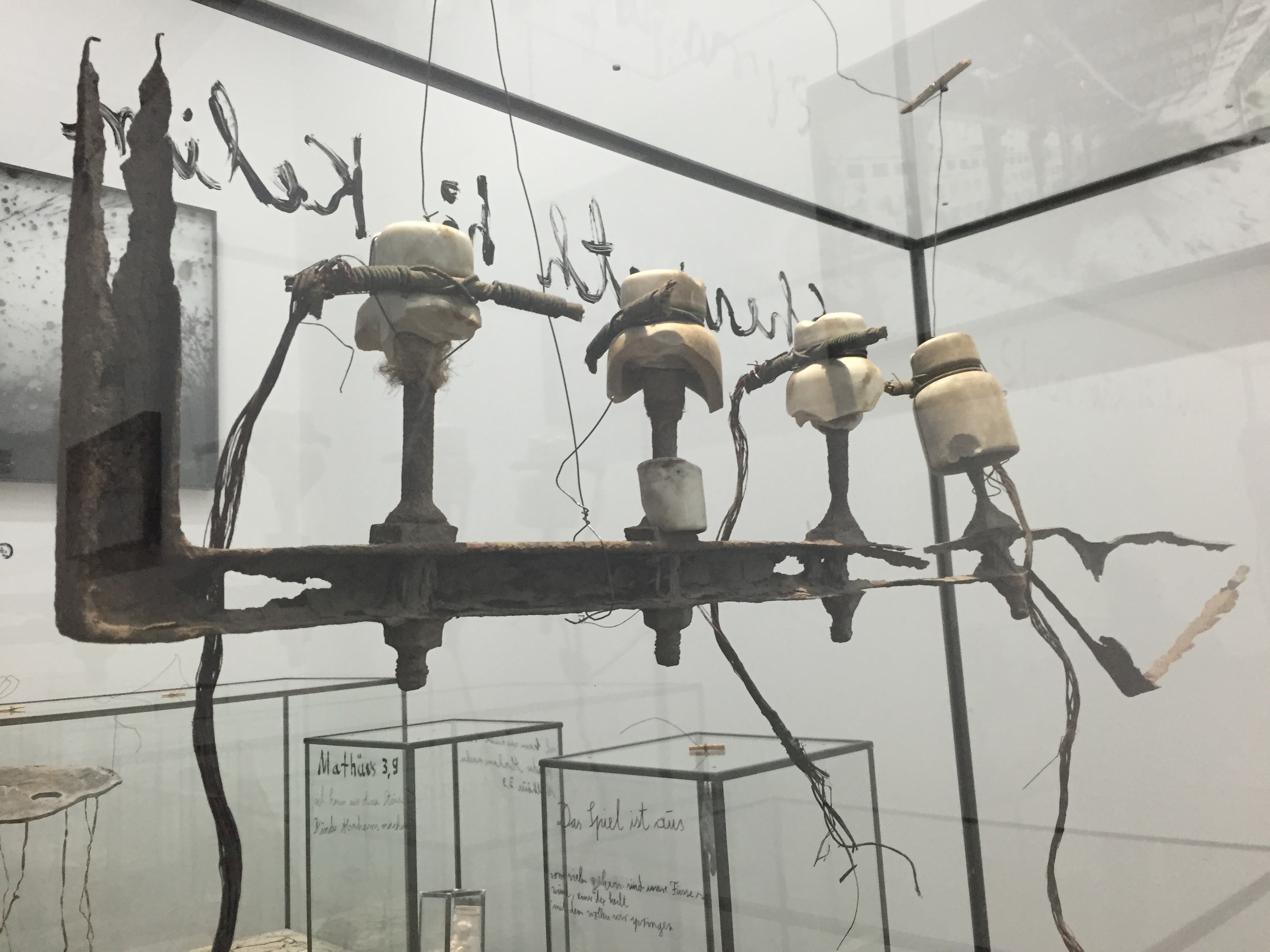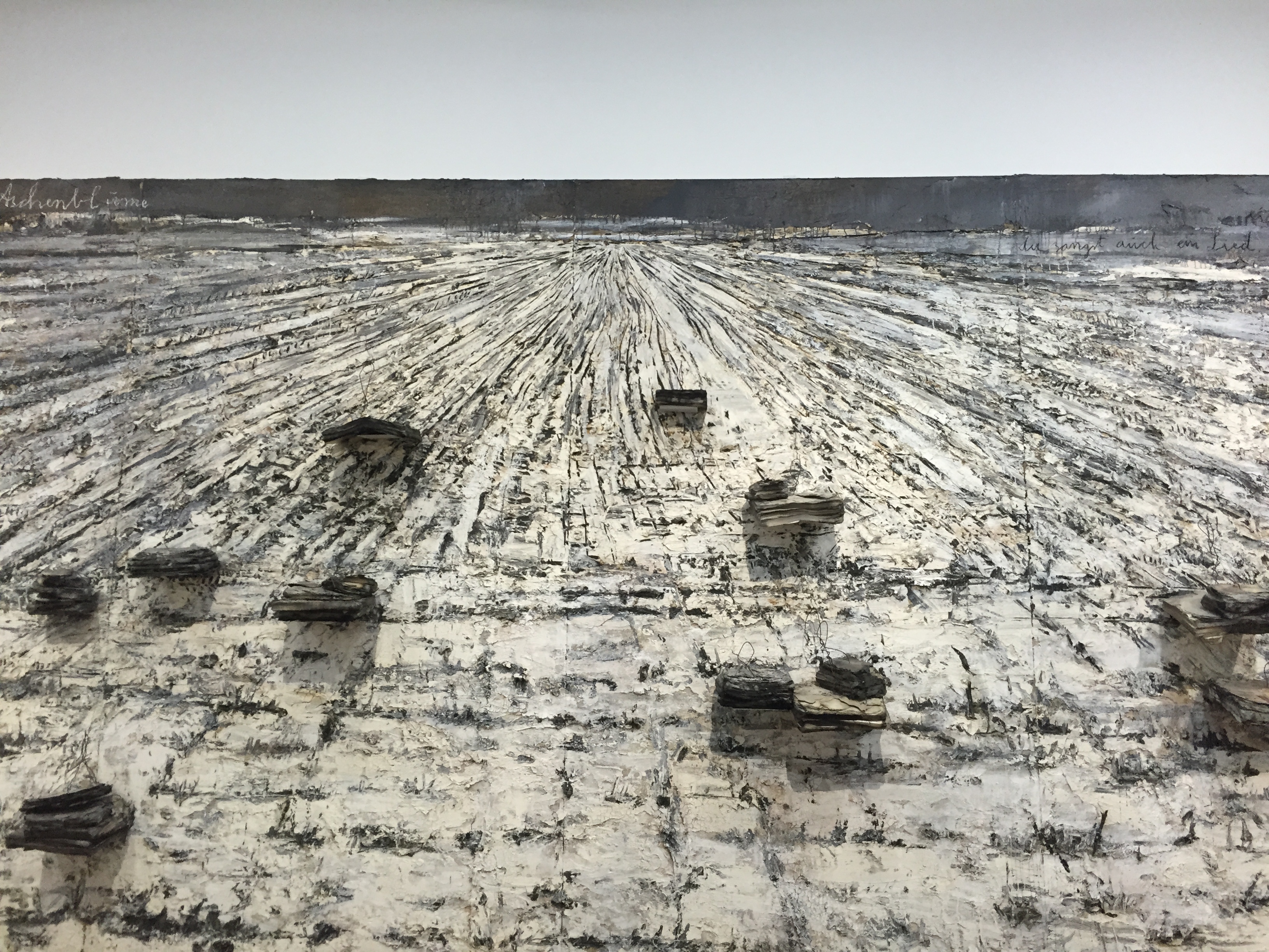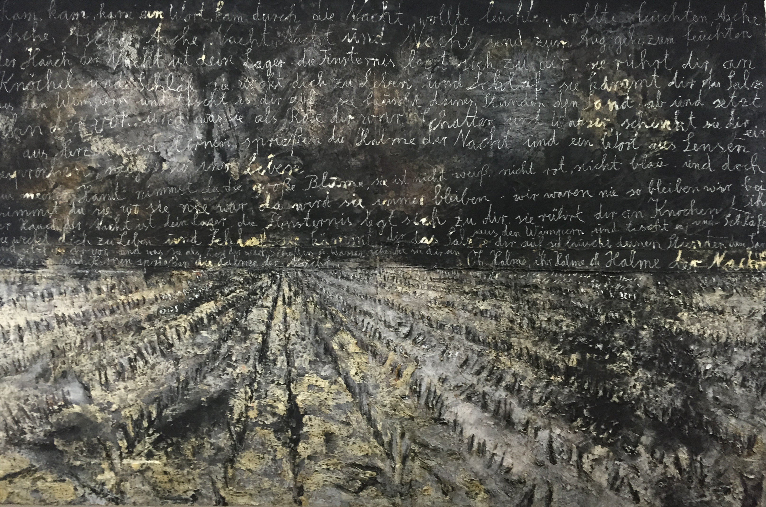 Kiefer travaille à un au delà de la peinture qui outrepasse l’espace pour nous faire habiter des lieux indicibles. Un de ses grands tableaux montre un champ dont les sillons sont recouverts d’écritures (l’écrit nourrissant la terre qui nourrit l’homme). Une peinture tellurique, où matière et signes se rejoignent et se répondent.