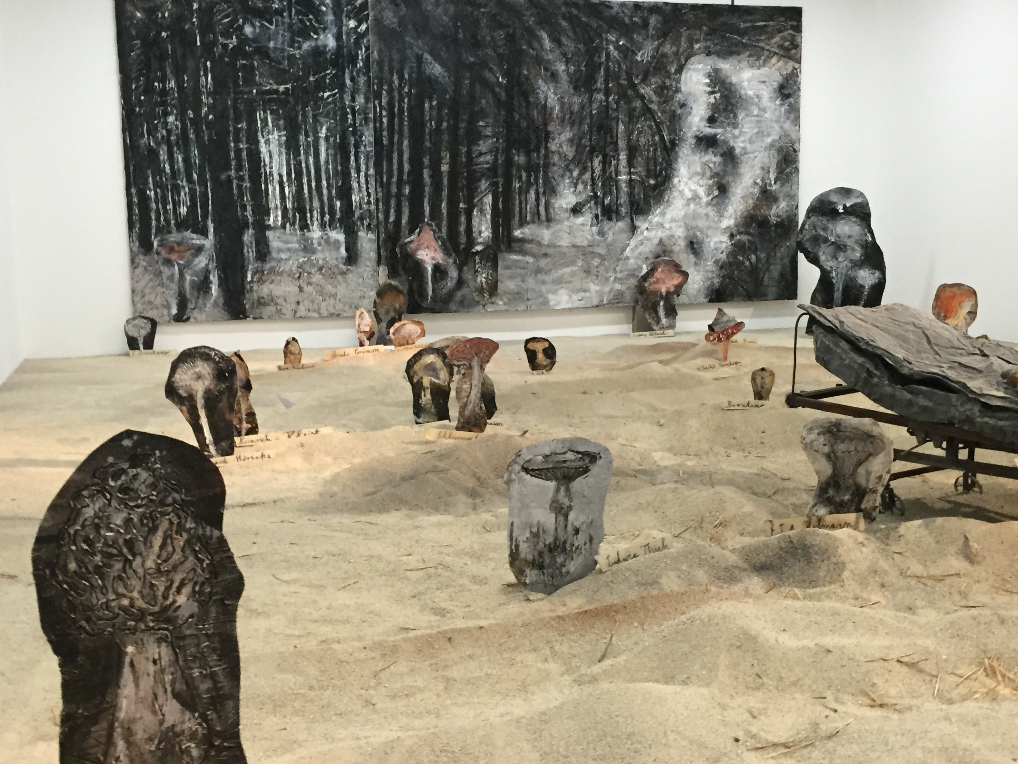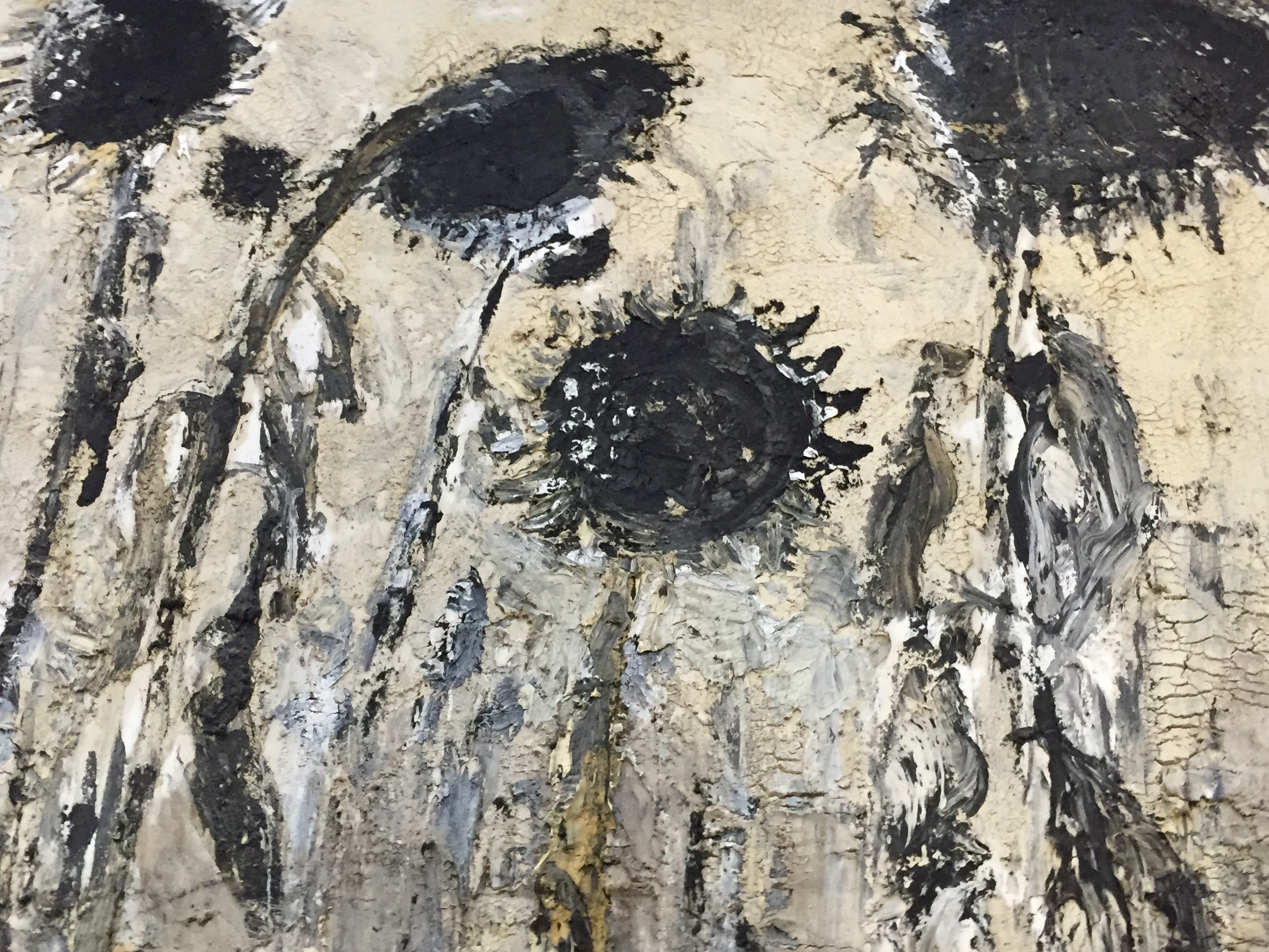Il n’y a pas d’êtres vivants dans les tableaux de Kiefer (qu’y faire ?), juste quelques représentations de corps allongés qui semblent se fondre ou parfois émerger de matières sablonneuses et grises.