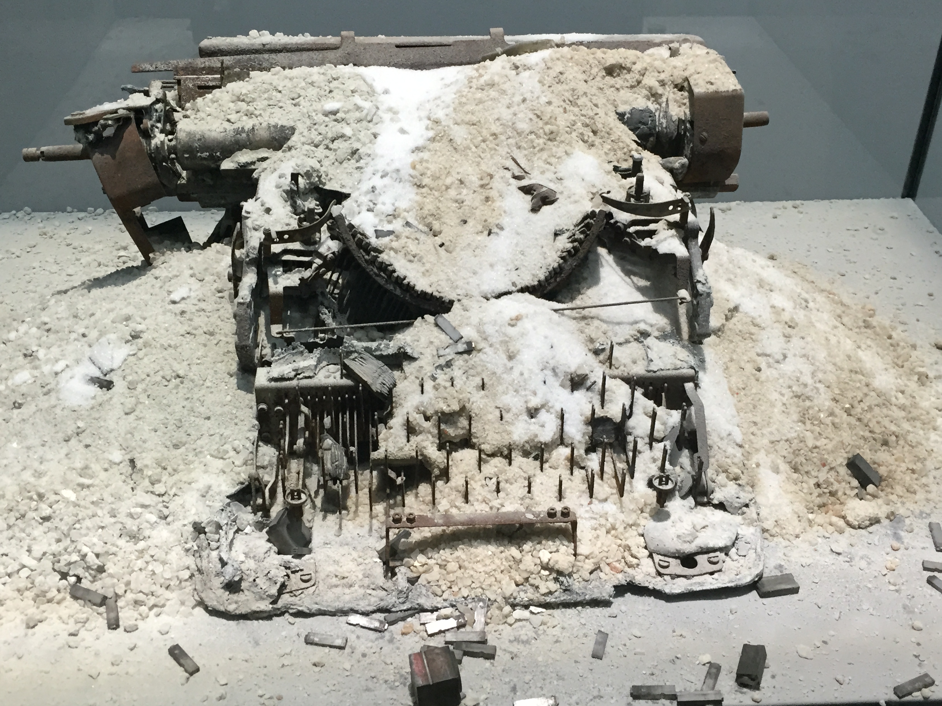 Ses vitrines aux vitres cassées et poussiéreuses offrent des visions fulgurantes d’objets-ruines de notre civilisation : lampes déchiquetées, outils abandonnés ainsi qu’une remarquable machine à écrire (ce qu’il en reste) couverte de poussières et de gravats laissant apparaître un visage grimaçant.