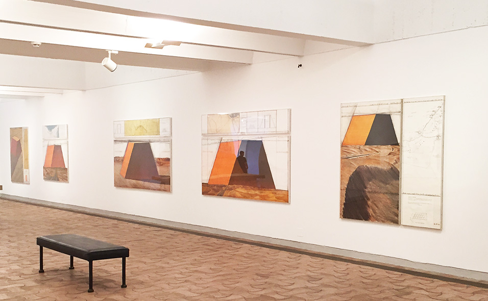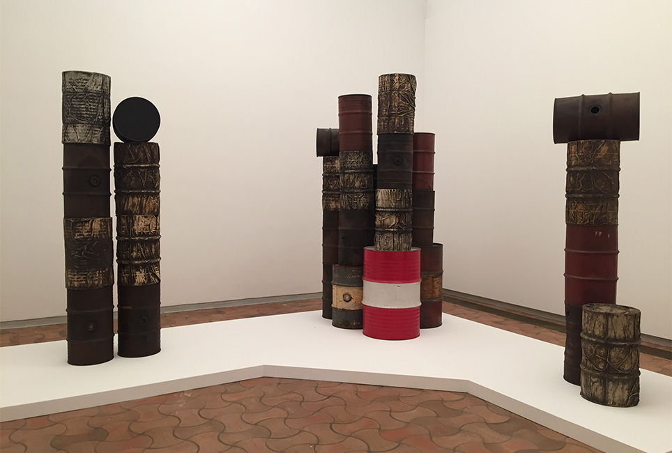 Il reste que l’ensemble de l’exposition est très riche : superbes dessins de ses projets, belles et émouvantes photos du couple sur fond de déserts, sculptures-assemblages de bidons (empaquetés ou non), telles des statues étonnantes de présence.