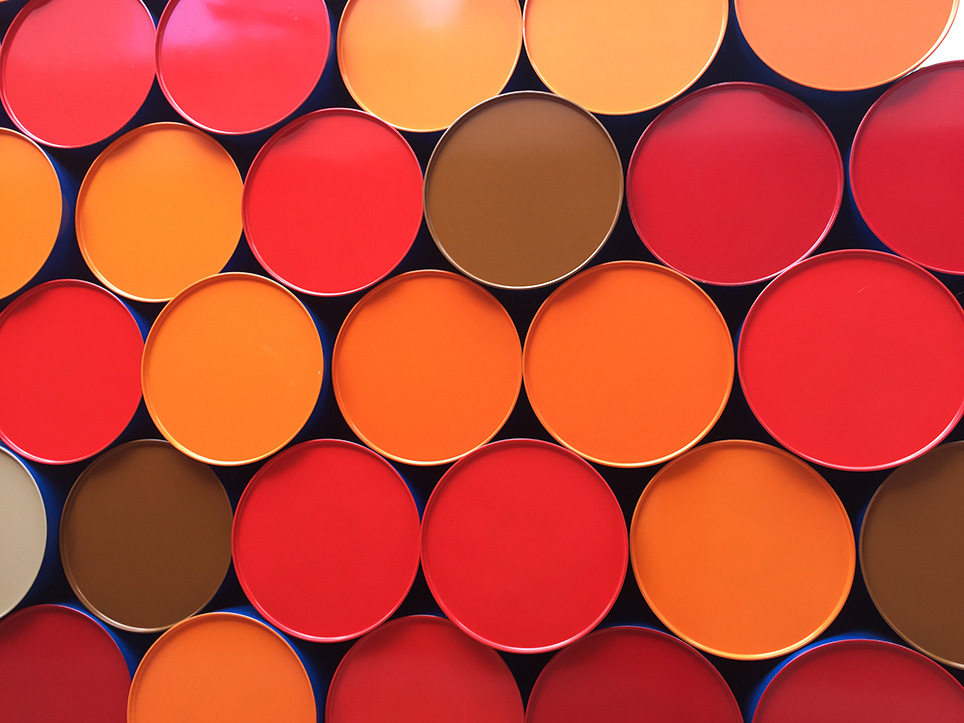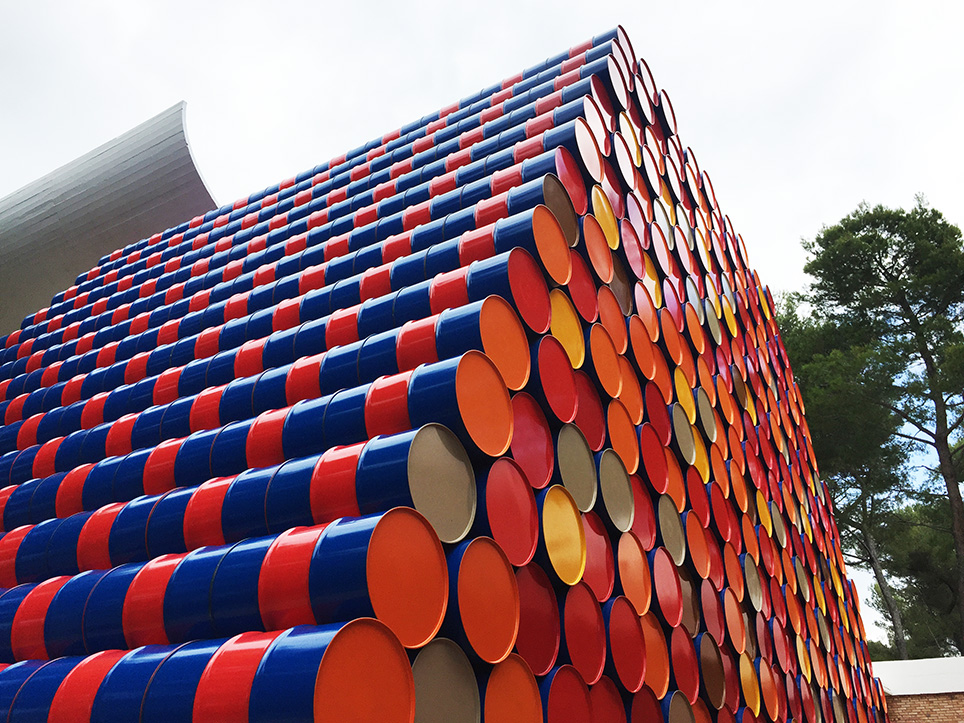 La mastaba de bidons présentée cet été à la Fondation Maeght est un projet de 1962 enfin réalisé, mais disproportionné : problème d’espace entre l’œuvre et la superbe cour Giacometti (trop grande, elle la bouche), de couleurs (bleu et rouge violents), de sens (les bidons de pétrole ne font plus rêver, au contraire), de déjà vu (de nombreux projets utilisant des bidons ont été déjà montrés).