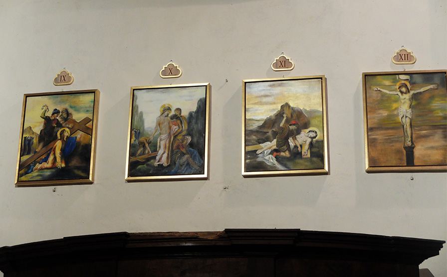 La galerie de l’Association Culturelle Sansalù al Borgo représentant Daniela, expose ses dernières œuvres : des enfants, un Jésus à terre avec un soldat prêt à planter les clous, une Vierge…, les pieds ensanglantés du Christ, etc.