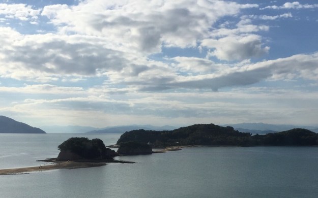 Shodoshima est une île bien plus grande, organisée touristiquement avec plein de dépliants vantant les beautés de l’île. Une fois encore, il y a trop à voir pour les trois jours où nous allons rester. Nous déjeunons sur le port dans le restaurant très spacieux d’un grand hôtel un peu vieillot et au charme désuet, comme dans un vieux film. La serveuse note étonemment notre commande avec un stylo directement sur sa main gauche. Le repas est excellent, comme toujours composé de nombreux petits plats, plus les bols de soupe et de riz.