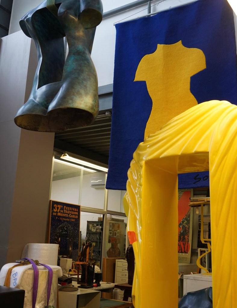 La scénographie imaginée par Mascha Sosno, épouse et muse de l’artiste, et Bertrand Roussel, directeur des musées d’archéologie de Nice, joue avec les formes : les belles courbes des statues confrontées aux arêtes vives des masses oblitérées par le vide ou le plein, et les couleurs : le rouge des « Venus » contrastant avec la complémentaire verte de la végétation alentours, les argentés (des « Huit manières de filer la soie ») avec le gris blanc des pierres, le jaune d’un beau drapé sur une pelouse d’un vert franc.