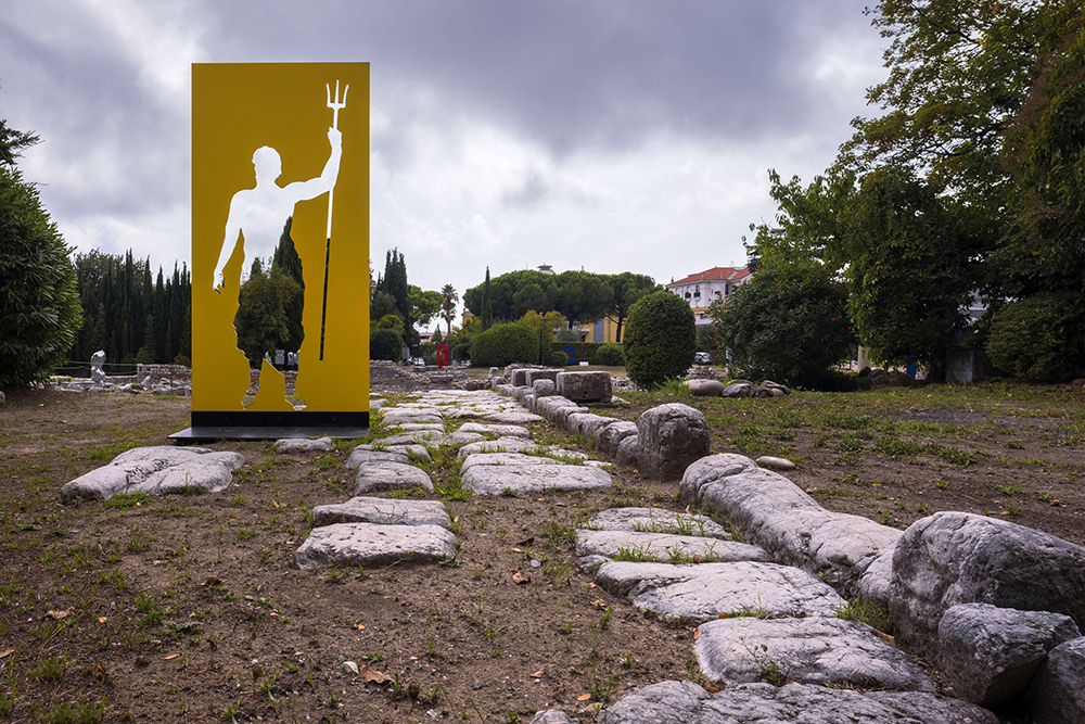 Une vingtaine de sculptures monumentales sont présentes sur le site : dieux et héros (Venus, Poseidon, le Discobole, etc.). Elles sont peintes de couleurs franches rappelant que les sculptures et les bâtiments romains étaient polychromés de couleurs vives.