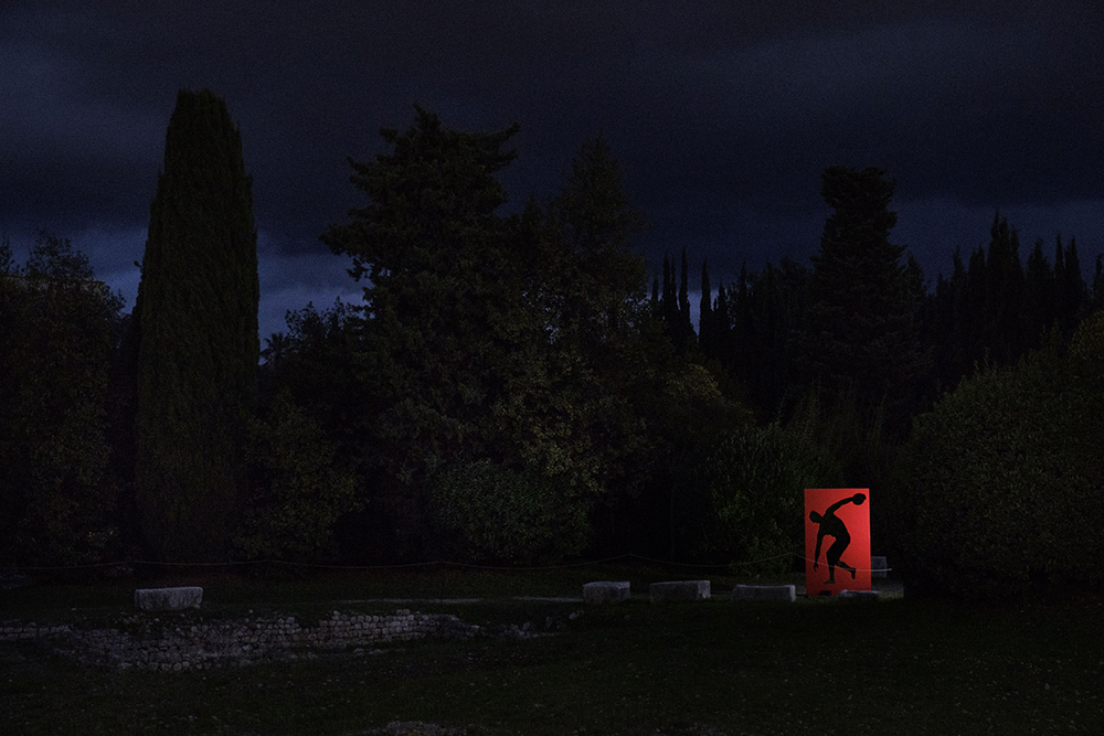 La scénographie imaginée par Mascha Sosno, épouse et muse de l’artiste, et Bertrand Roussel, directeur des musées d’archéologie de Nice, joue avec les formes : les belles courbes des statues confrontées aux arêtes vives des masses oblitérées par le vide ou le plein, et les couleurs : le rouge des « Venus » contrastant avec la complémentaire verte de la végétation alentours, les argentés (des « Huit manières de filer la soie ») avec le gris blanc des pierres, le jaune d’un beau drapé sur une pelouse d’un vert franc.
