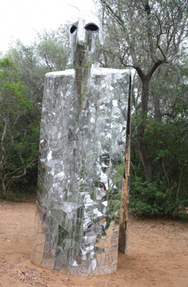 A l’intérieur de la mère qui brille de ses milliers de miroirs reflétant la lumière indéfiniment, trois sculptures de taille humaine : le Chariot (carte 7) qui « représente la victoire, du triomphe sur ses adversaires, sur ses problèmes » ; « l’Etoile du Renouveau » (carte 17) qui représente pour elle « un être complet, pas fragmenté, la santé physique et spirituelle » ; la troisième, le Jugement (carte 20), appelle aussi au renouveau : « Trois personnages sortent d’une tombe : un enfant, un homme, un vieillard. Ils représentent les parties de nous mêmes que nous devons réunir. L’ange (qui les regarde de haut) les « invite à ne plus être divisés, de lever notre regard au ciel et de s’unir ».
