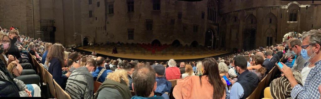 Ce qui frappe en rentrant dans cet espace somptueux qu’est la cour du Palais des Papes, c’est la scène couverte de sièges.. Très grande, sans aucun décor à part les belles arches médiévales. Des chaises simples sur plusieurs rangées et tournées vers nous. Déjà, la distinction spectacle-spectateurs est rompue, abolie. Les acteurs vont-ils s’asseoir en face de nous et nous regarder ? Bizarre ! il y a bien une cinquantaine de chaises… seront-ils si nombreux ? Un homme habillé d’un costume couleur rouille se promène entre les chaises, puis s’assoit devant nous. La cour se remplit vite, on entend le brouhaha habituel du public qui s’installe. Les gens ne semblent pas s’étonner de ce qu’il y a sur scène. Puis tout le monde attend la mythique Isabelle Huppert. Ce spectacle a été pensé pour elle. C’est précisé dans l’interview du réalisateur Tiago Rodrigues (qui succédera à Oliver Py l’année prochaine). Il est attendu pour cette reprise de la dernière pièce de Tchekov (souvent venu à Nice – on a une rue à son nom, quartier des Musiciens). Tiago Rodrigues dit qu’il a voulu travailler avec Isabelle et qu’ensemble, ils ont choisi La Cerisaie, cette pièce crépusculaire qui résonne bien avec la fin d’un monde.