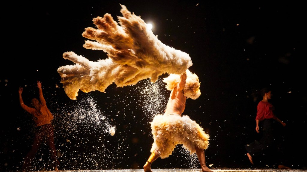 Chorégraphie, acrobatie, performance musicale et plastique, théâtre, cinéma en direct, tout est mêlé dans ce ballet de fin du monde.