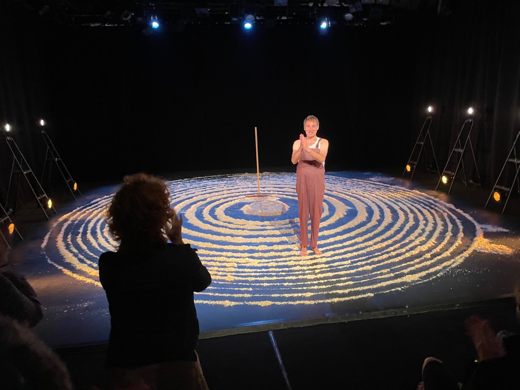La scène est séparée en deux par une large ligne de pigments noir et de paillettes qui vont venir se coller au corps transpirant de la danseuse. Libérée de ses liens, elle est habillée de poudre noire et de grains étincelants.