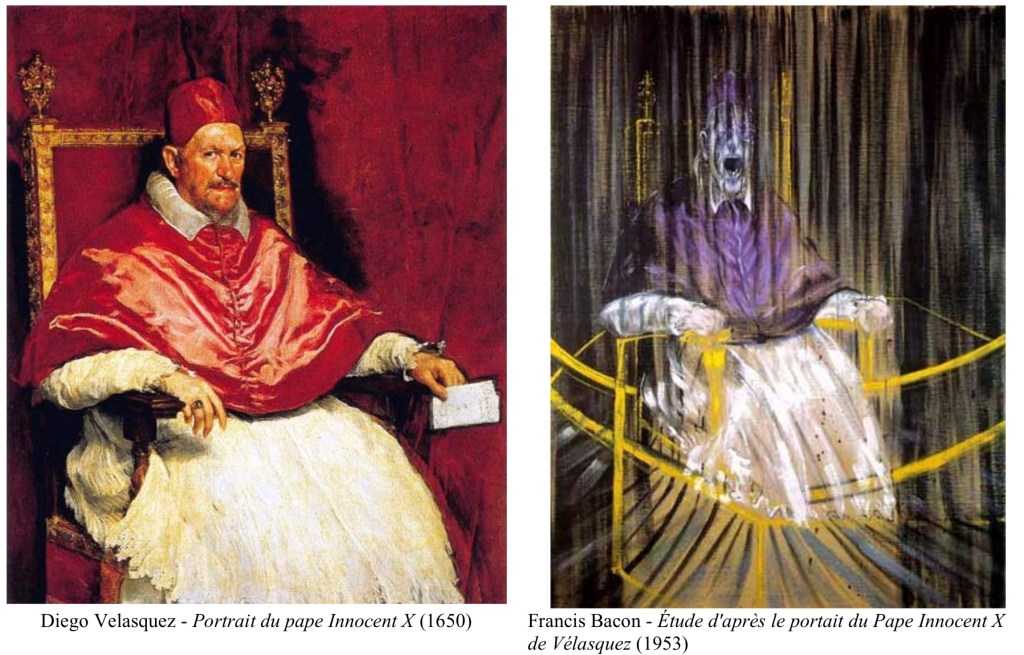 *On pourrait se demander pourquoi ce pape a tant marqué Bacon qu’il en a fait plus de quarante-cinq copies (entre 1949 et 1965). Alessandro Zinna, auteur de l’article : « L’obsession de Bacon pour le pape de Vélasquez » (https://mediationsemiotiques.com/archives/4260) propose une interprétation psychanalytique : ce pape (papa), à l’apparence solitaire, serait en train de crier à la figure d’un adolescent nu disposée devant lui et cachée dans le rideau… Cette image renvoie à un vécu du jeune Francis face à son père qui l’a découvert porteur de sous-vêtements de sa mère et l’a renvoyé du domicile familial.