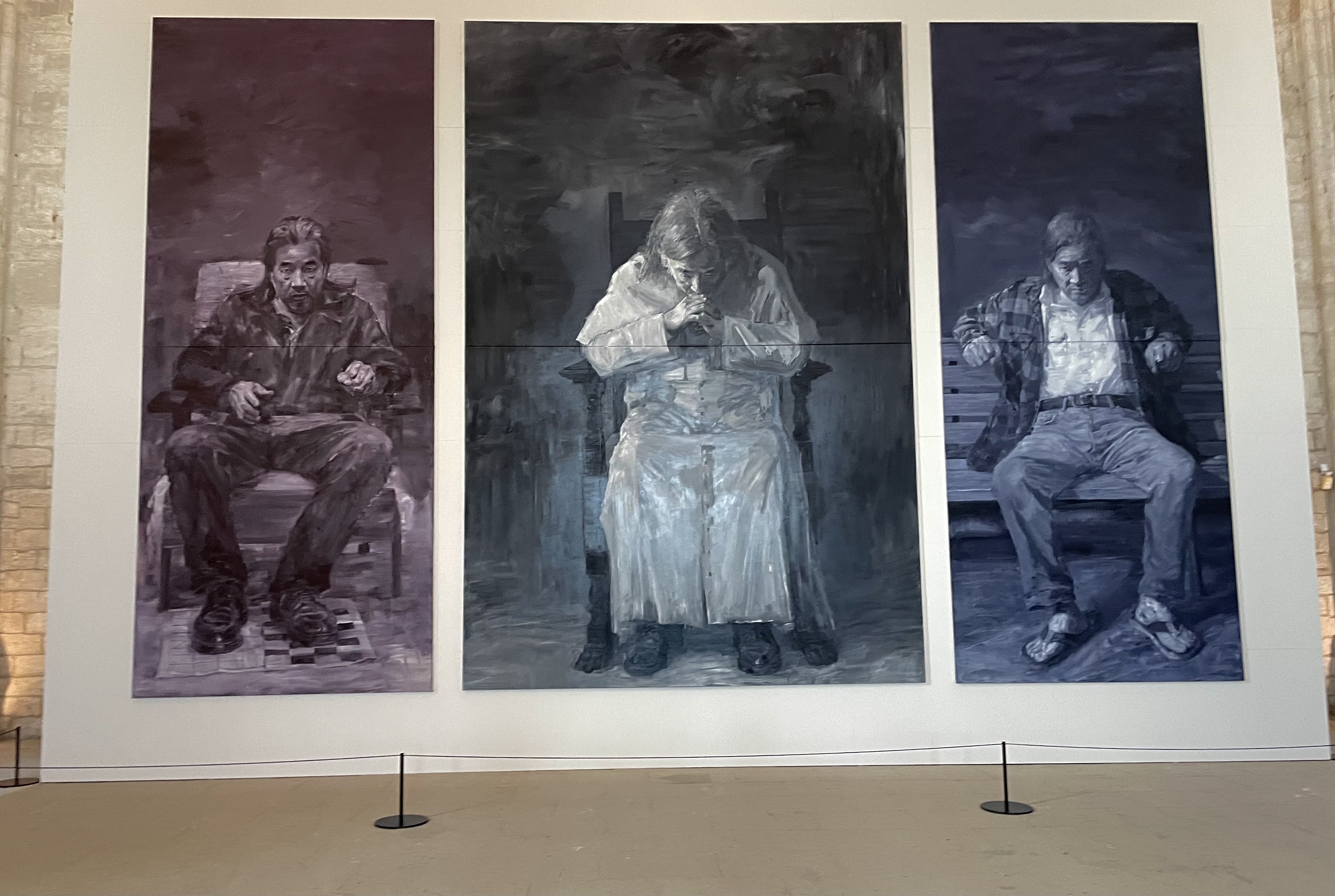 Deux portraits de sa petite série consacré au pape sont présentés : un en noir, un en rouge. Il en existe d’autres : en vert, et notamment un en bleu où le c’est le fauteuil qui se dissout au sein dans les grands mouvements gestuels qui animent le fond.