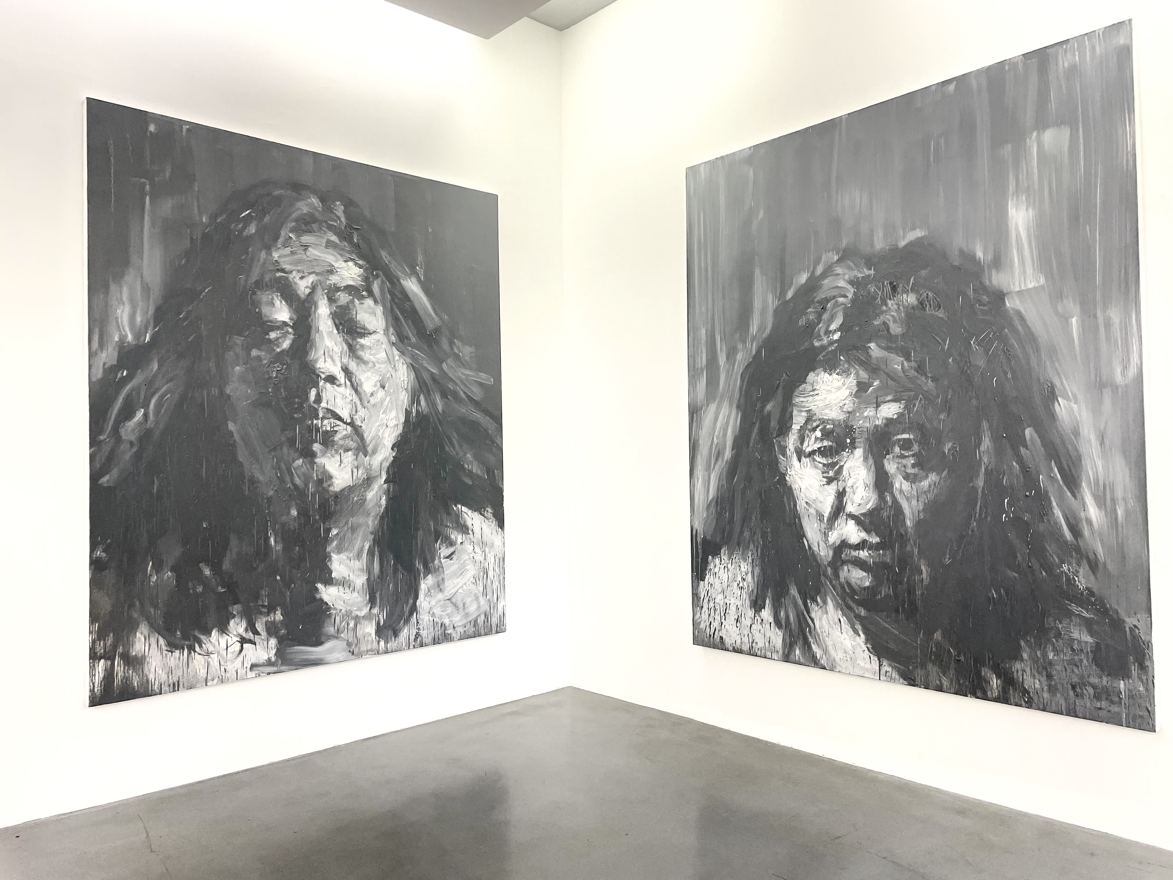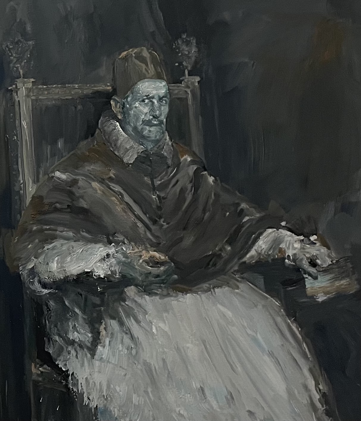 Yan Pei-Ming a cédé lui aussi à la fascination du pape Innocent X, immortalisé par Francis Bacon* d’après Velasquez. C’est cette interprétation par Francis Bacon qui l’a troublé, il y a retrouvé son propre besoin d’agressivité, sans malgré tout atteindre la fureur exprimée par Bacon. Il le reconnaît d’ailleurs : « Réinventer Velasquez sans copier Francis Bacon, s’est avéré très difficile ». Peindre, c’est également s’inscrire dans une relation avec des œuvres qui l’ont marqué.
