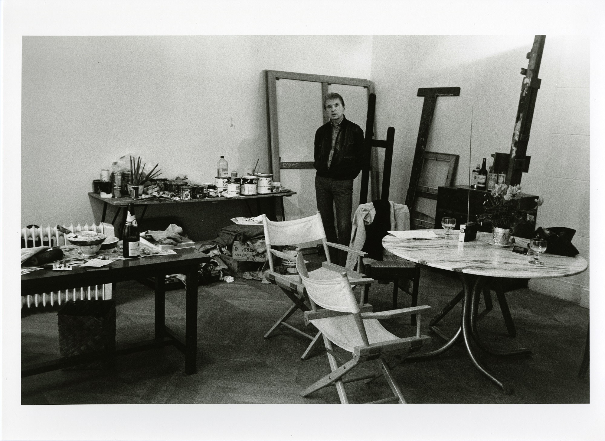 La visite se poursuit par la découverte des premières photographies de cet atelier, prises par l’historien de l’art Sam Hunter en 1950 qui décrit déjà « les tables jonchées de photographies et de coupures de journaux et de photographies ou de portraits de personnalités » qu’on retrouvera dans ses ateliers suivants comme celui de Overstrand Mansions (1955-1961) où papiers, cartons, livres entassés tapissent le sol ou débordent des tables et des étagères.