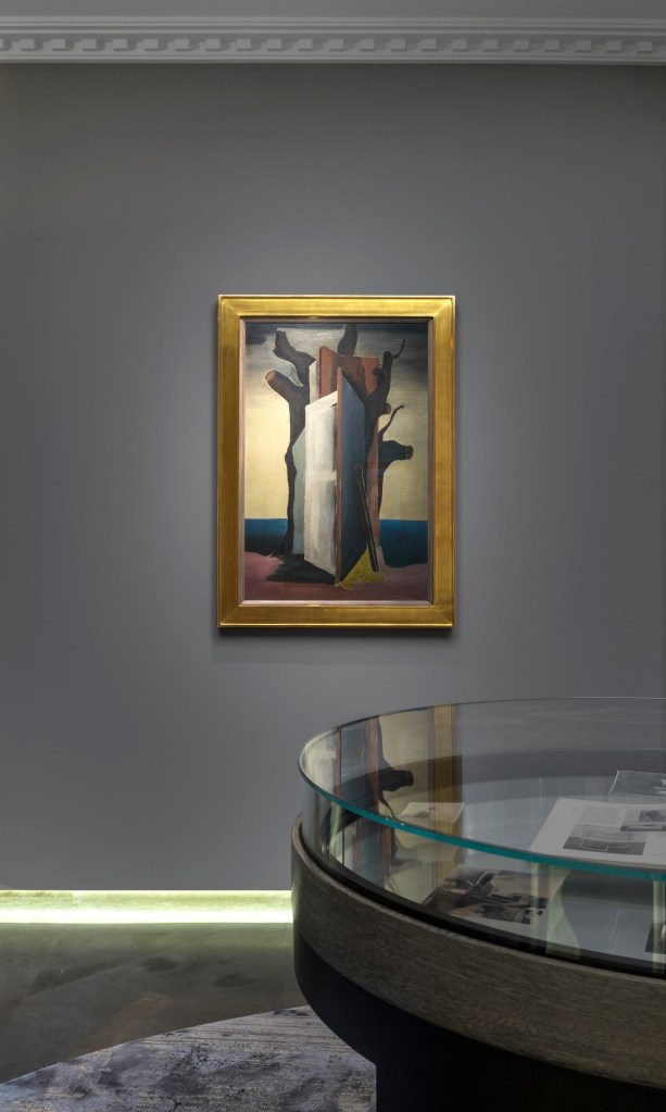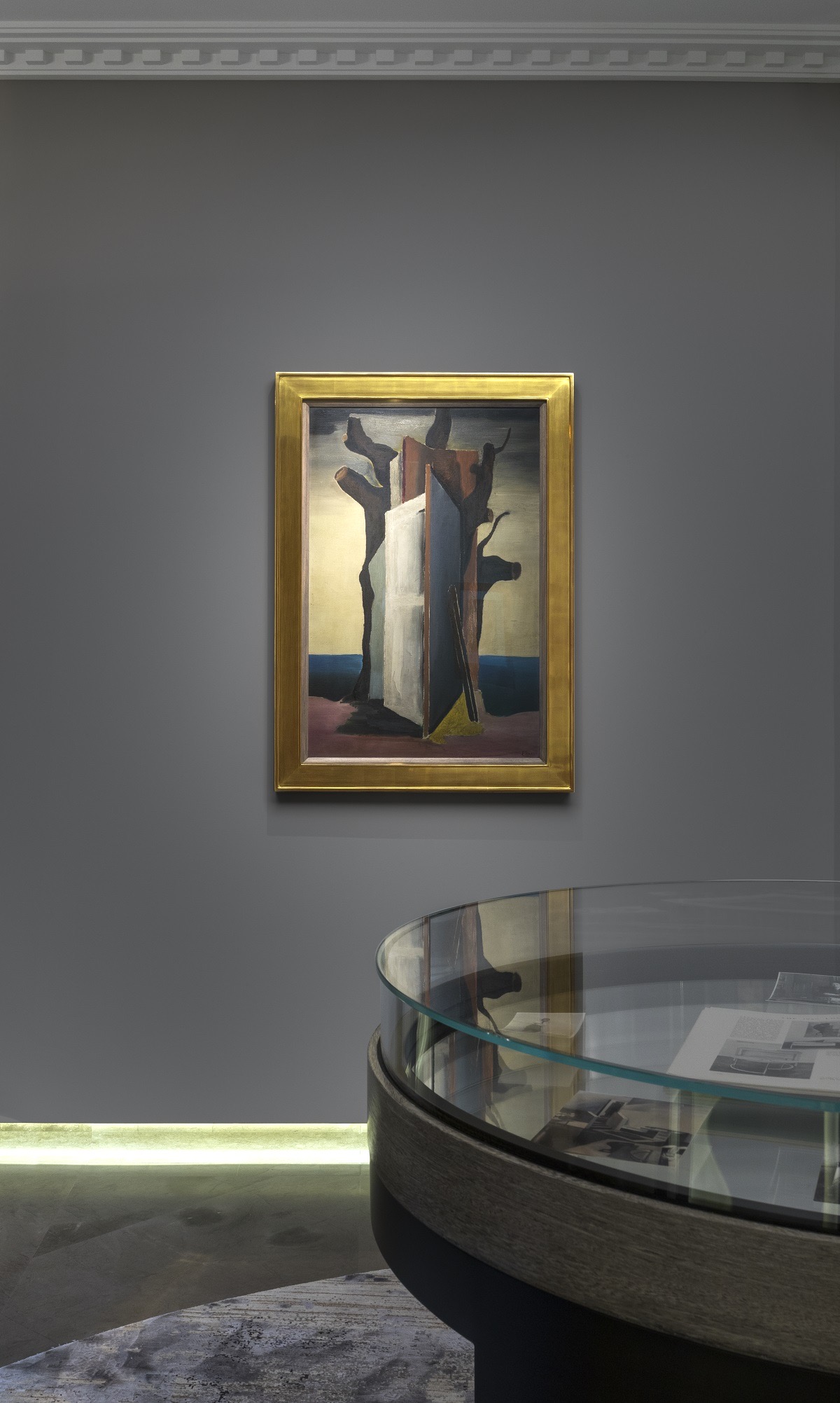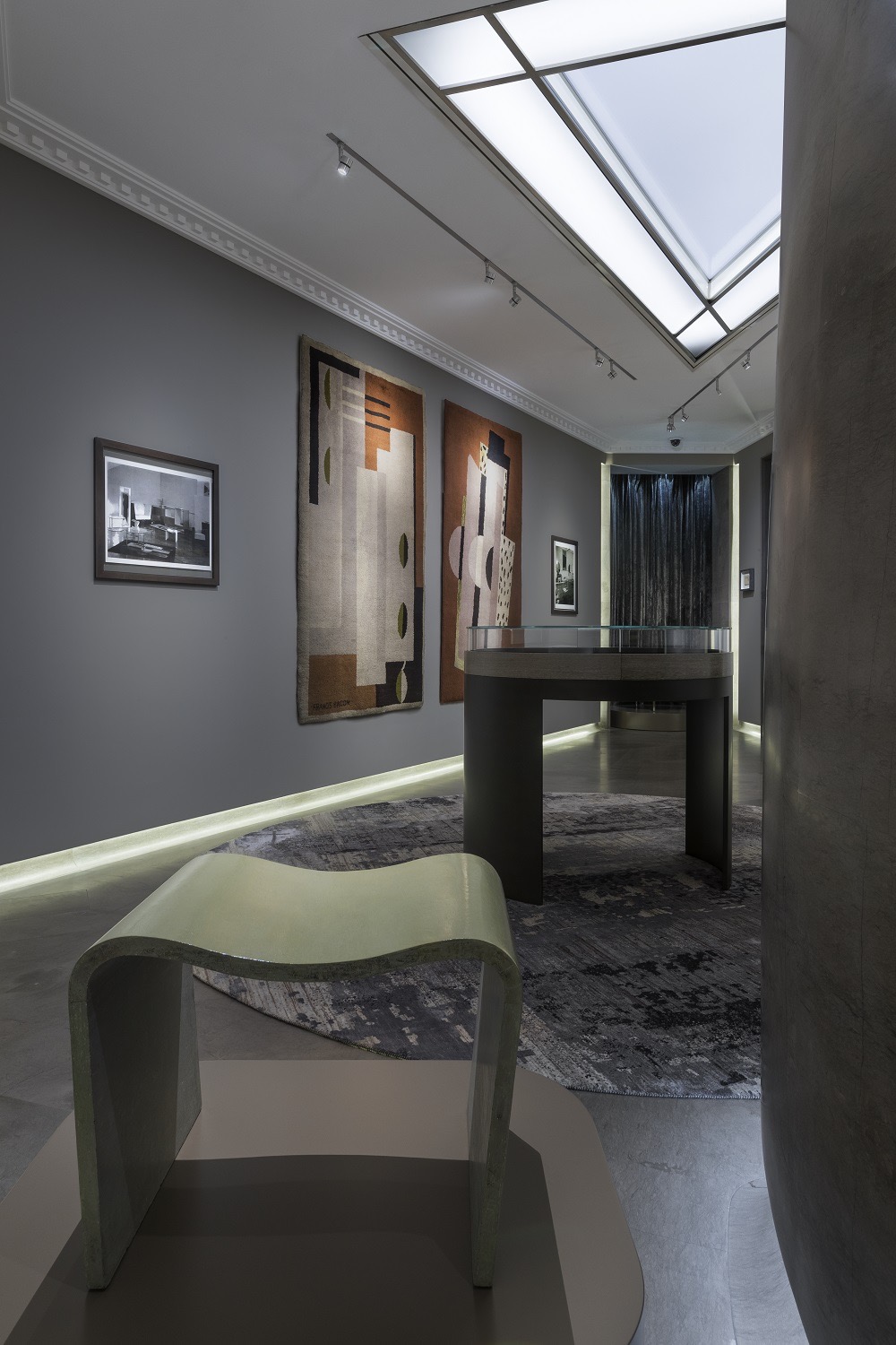 Dans la première salle de la Fondation sont présentés une table aux structures en acier tubulaire et un tabouret, des meubles à la grande sobriété graphique, deux grands tapis signés de son nom ainsi que ses premières peintures d’inspiration surréaliste ou cubiste dont ‘Painting’, 1930, sa première huile sur toile. Design, lignes pures, géométrisation, matériaux simplifiés destinés à la fonctionnalité, aux loisirs caractérisent son style en accord avec celui de l’époque.