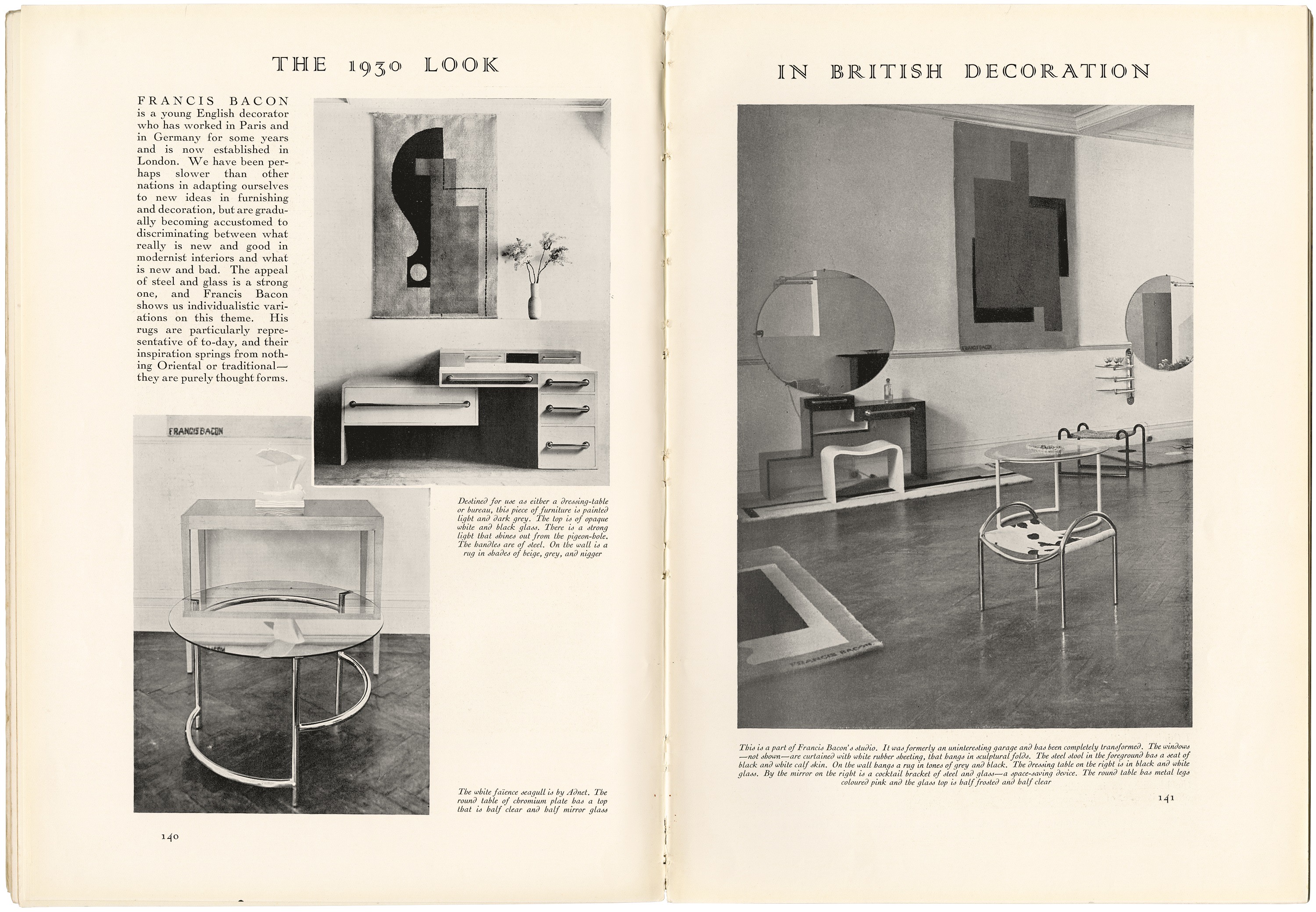 Les photos, les documents et meubles de cette salle complètent la présentation du jeune Francis Bacon, alors âgé de 21 ans, dont les créations déjà reconnues bénéficient d’une double page dans la revue Studio Magazine de 1930.