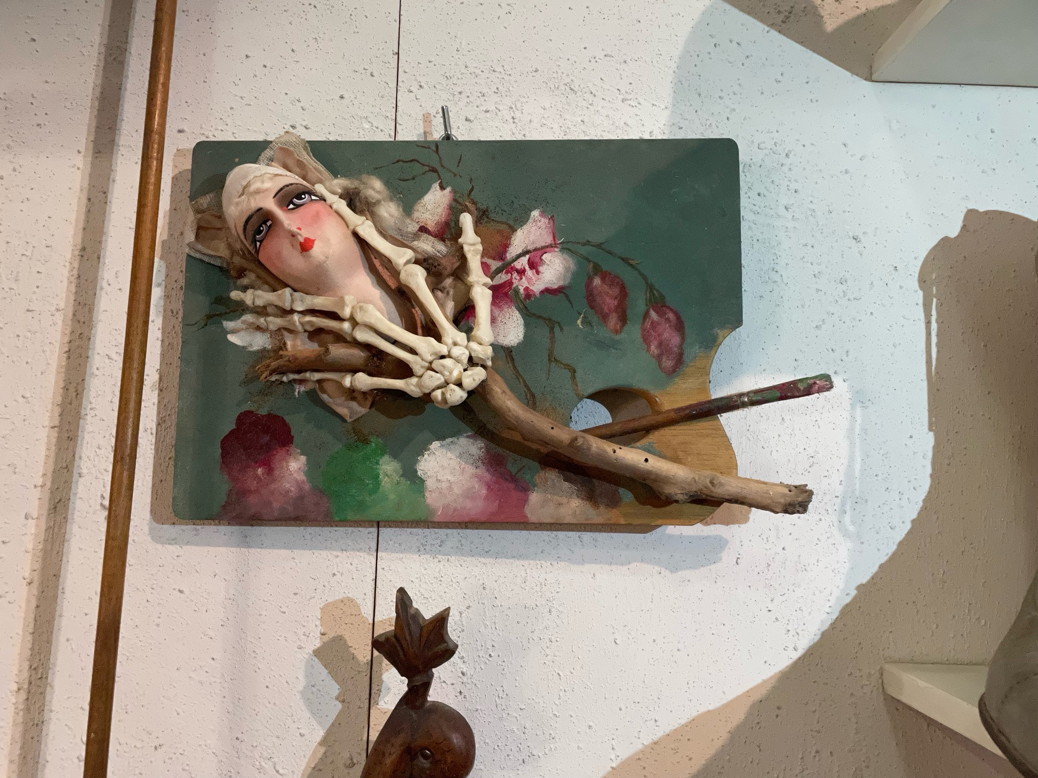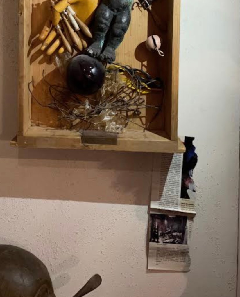 D’autres : boîtes d’os, vieux tableaux à détourner, tapis, objets indéfinissables, renvoient aux « objets ethnosyncrétiques » que Spoerri réalise dans les années 1970-80, d’autres encore sont des collages d’objets insolites quelquefois violents, telle cette tête verte aux yeux crevés par des grands ciseaux. Quelques petits cadres présentent des « Memento Mori ». Certains objets semblent avoir été choisis pour leur esthétique (grandes cornes de gazelle) ou pour l’intérêt particulier que l’artiste porte aux chaussures : de femmes, d’hommes, des savates, des mules (une retournée, etc.) ainsi que plusieurs formes en bois ayant servi à faire des chaussures, récupérées probablement dans les brocantes, les cordonneries fermant par centaines du fait de l’industrialisation.