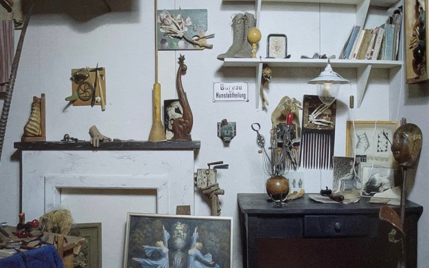 À l’entrée, une plaque : « Baldreich (bientôt riche) » annonce avec humour le désir de célébrité de l’artiste et à l’intérieur, une seconde plaque : « bureau der Kunstatelhung » (jeu de mots entre bureau de l’administration artistique et bureau de guérison artistique » indique le souhait qu’une guérison (de ses névroses ?) peut advenir grâce à son activité artistique (pour Freud, la création, qui est une sublimation, est la seule activité non névrotique).