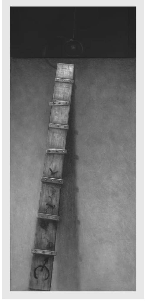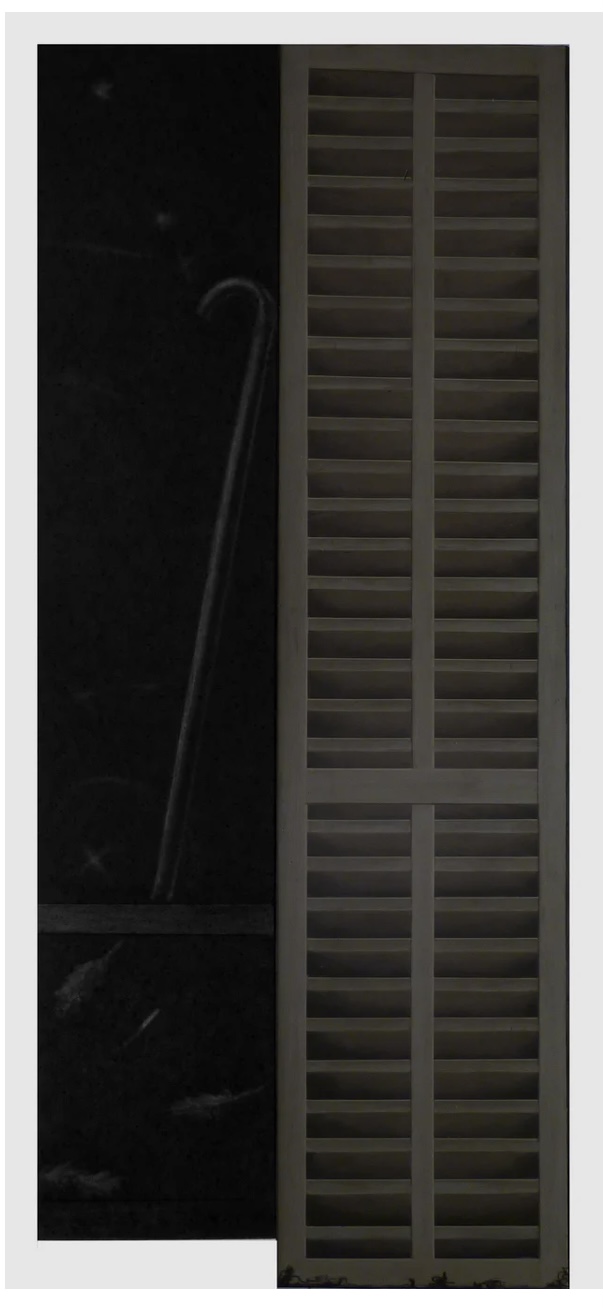 « Escale », juste une fenêtre (on est à l’extérieur), en rez de chaussée puisque l’artiste nous met frontalement devant elle, sinon il faudrait imaginer qu’on est sur l’immeuble en face qui serait très proche. Elle est à moitié fermée, admirablement dessinée et peinte d’une couleur de bois tendre. On aperçoit une partie en fer forgé de la balustrade, puis une canne qui semble flotter dans l’air à moins qu’elle ne soit posée sur la balustrade, auquel cas, elle est en équilibre instable, appuyée à la fenêtre et son pied reposant sur une surface peu épaisse. Encore une question : Que fait-elle là ?