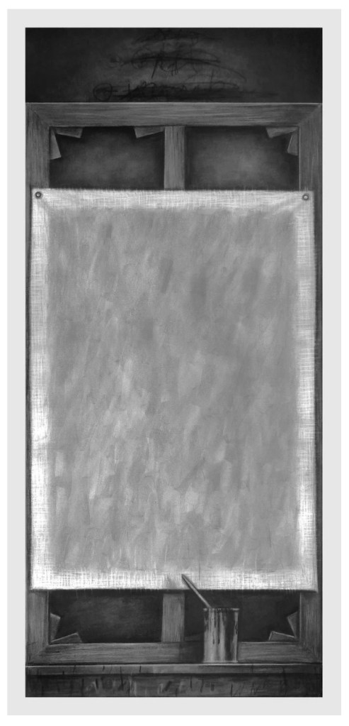 Ainsi « peinturages » présente un châssis sur lequel est punaisée une toile qui n’est pas à la bonne dimension. Elle est petite et on voit déjà qu’elle a été travaillée par un estompage grisé, une base sur laquelle l’artiste va attaquer son dessin. Le pinceau est prêt, trempant dans un gobelet dégoulinant (il a donc été déjà utilisé). Ce n’est donc pas un dessin mais une peinture, l’artiste nous signifiant peut être que ses dessins sont en fait des peintures, ou en tous cas, participent de la peinture. Il y a également quelque chose d’arrêté dans ce qu’on voit, comme si le peintre était devant et se posait le problème que connaît tout créateur : « que vais-je faire maintenant ? ».