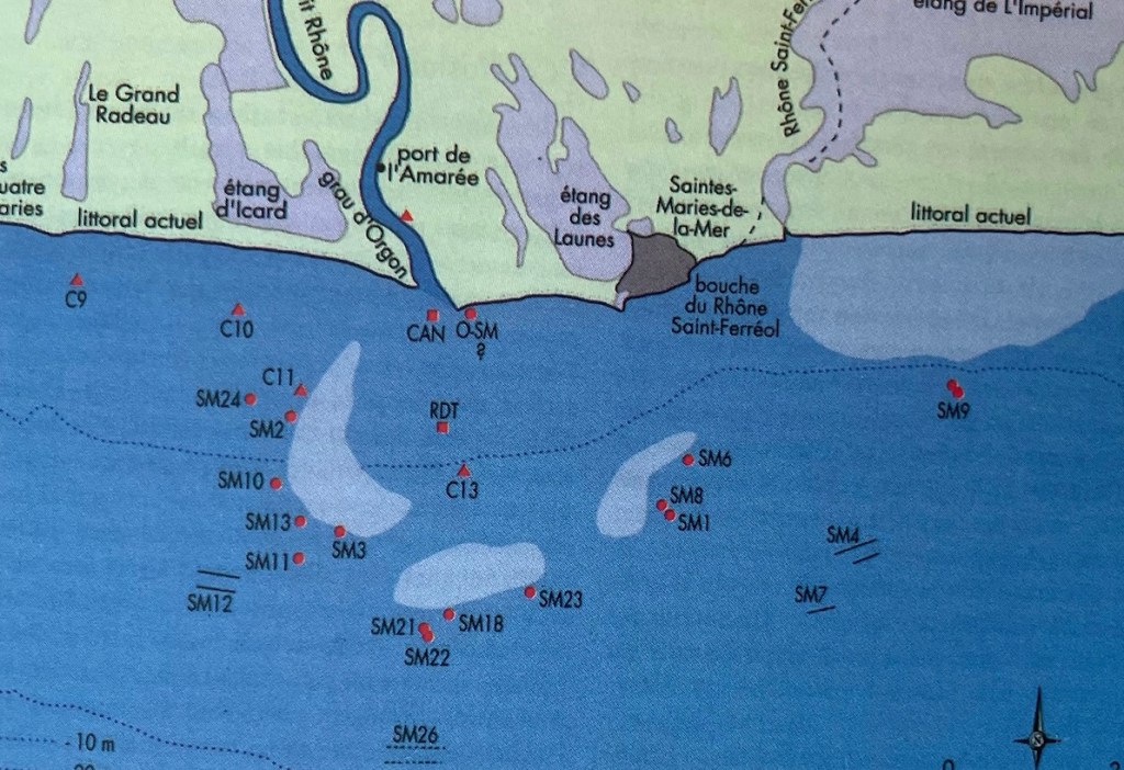 Il existait déjà un catalogue de 400 navires échoués dans la région qui va lui être utile pour approfondir ses recherches et établir plusieurs cartes qui révèlent la concentration d’épaves au large des Saintes, à l’embouchure de l’ancien bras du Rhône dit de Saint Férreol.