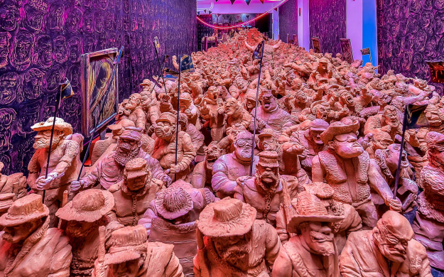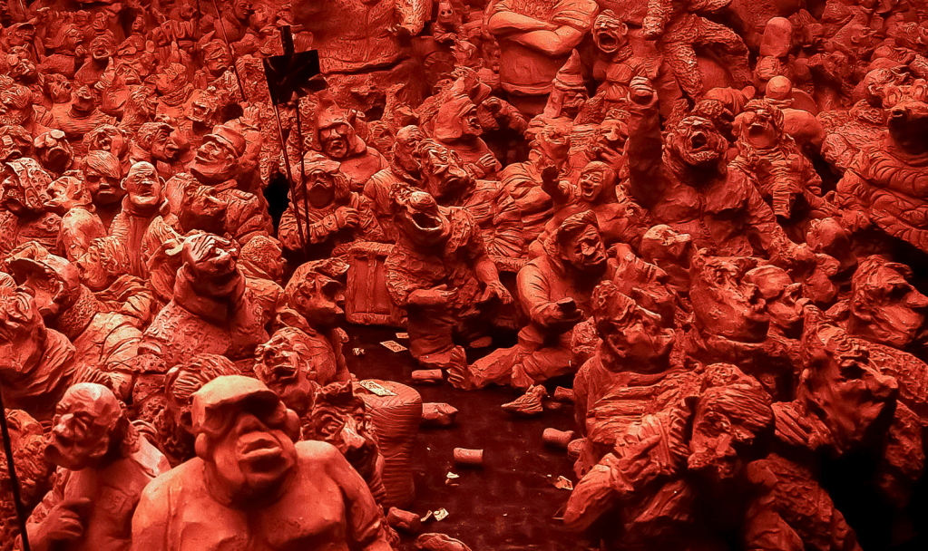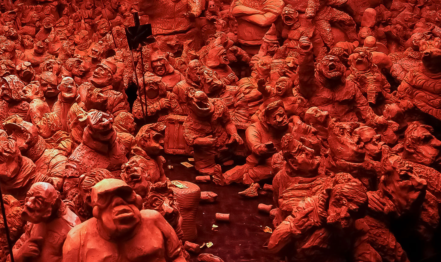 Captivés par l’intensité de cette procession, on pourrait rester des heures à regarder chacune de ces figures grotesques, de ces gueules cassées déformées par le ressentiment. Des arrêts sur images nous permettent de détailler des attitudes et des visages. Ces mille sept cent figurines, avancent vers l’entrée, on craint qu’elles déboulent dans la rue…