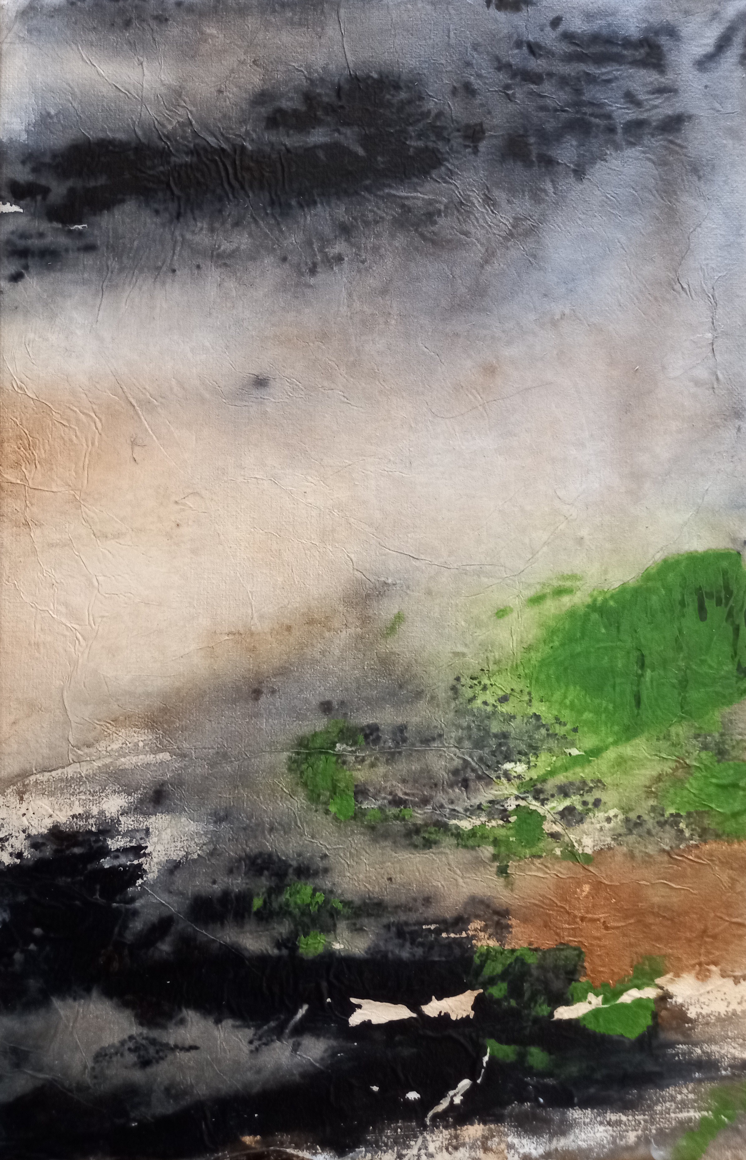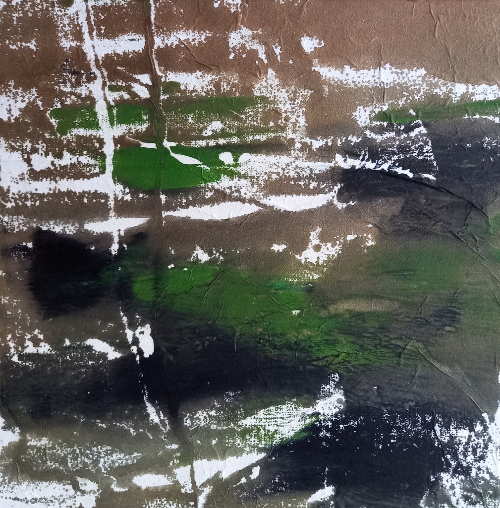 Elle entre dans le motif, choisit des parties qui lui racontent des histoires, réalise un travail complexe et sensible à la lisière du figuratif et de l’abstrait où c’est la nature qui s’impose, créant une alchimie d’impressions colorées : paysages de forêts, de sous-bois, de lacs, d’eaux stagnantes, de nuages, de brumes, de mousses, de feuilles, de veinules liquides, de branchages, etc. Des séries se créent où le vert domine.