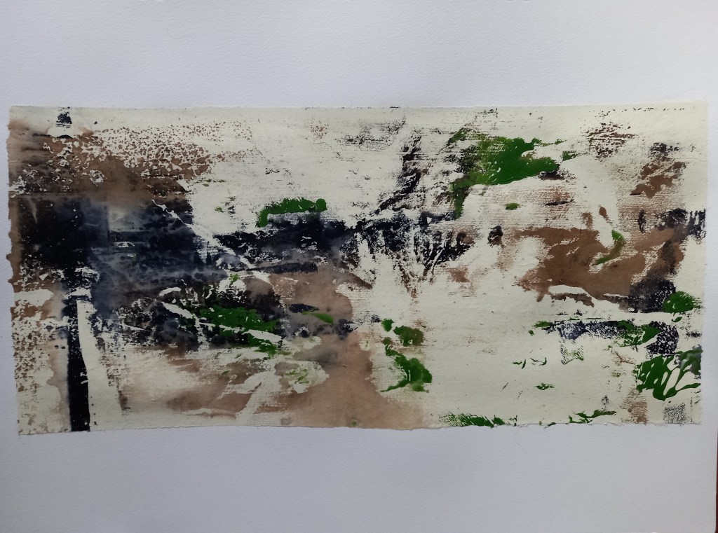 Elle entreprend un travail à la manière japonaise sur de grandes longueurs avec impression d’encres qui en séchant adhèrent et se mêlent au papier. L’artiste a appris le collage avec un maître thaïlandais qui lui a enseigné comment masser ce matériau pour qu’il adhère à la toile, en chassant l’air délicatement. Elle expérimente longuement le jeu des pigments avec l’eau et les liants qui en séchant produisent une révélation proche de la photographie.