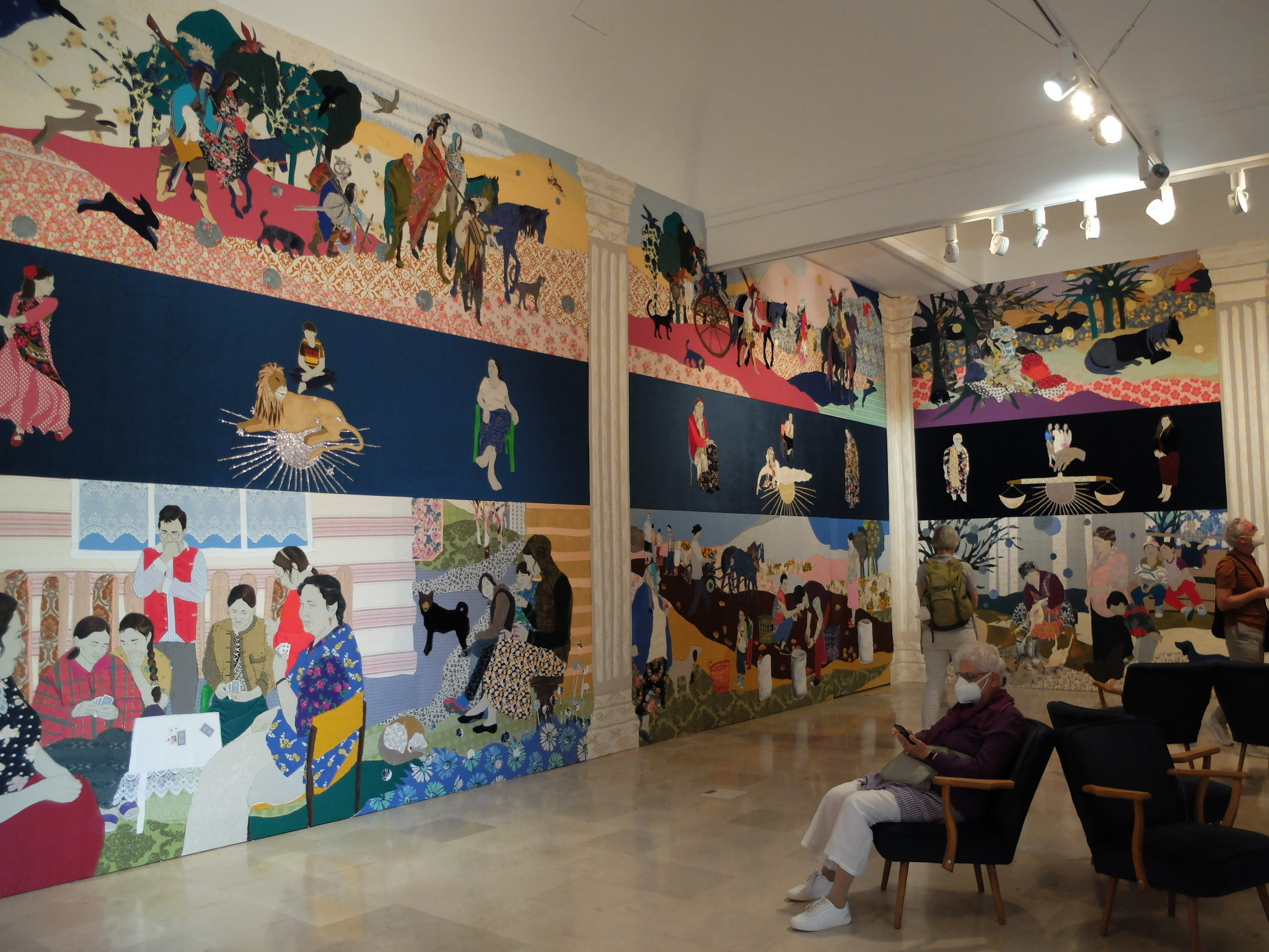 Le pavillon polonais est couvert par des tapisseries de l’artiste rom Malgorzata Mirga-Tas. Un immense patchwork de personnages en tissus de couleurs cousus racontant l’épopée mythique des Roms vers l’Europe, des scènes de la vie quotidienne, des symboles… une œuvre puissante.
