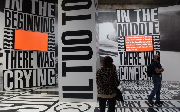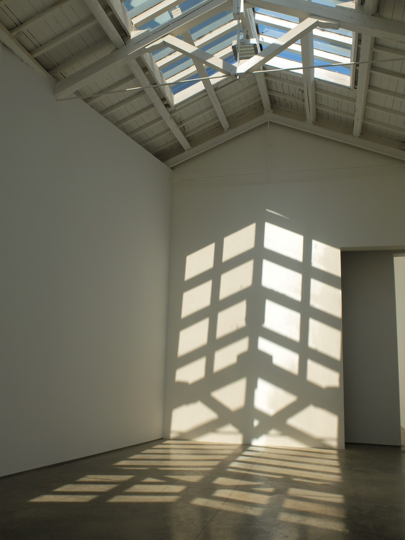 Le Pavillon espagnol est remarquable pour sa simplicité et son minimalisme – on ne peut peut pas faire moins – il expose… des ombres – ses propres ombres, celles créées par les verrières du plafond qui se projettent sur les murs d’un blanc immaculé. Ce sont des ombres de formes géométriques qui forcément évoluent selon le trajet du soleil. C’est très beau, pur, reposant. Cela semble simple mais il a fallu pour cela démonter en partie le plafond, mettre des verrières. Ignasi Aballí, l’artiste barcelonais a dû calculer pour savoir comment la lumière allait jouer, créer des cloisons de différentes hauteurs pour « casser» les ombres, créer des salles de différentes tailles, des couloirs. Ainsi l’architecture est elle-même doublement œuvre plastique. On est loin des salles surchargées d’objets ou de couleurs. L’exposition se nomme : “Corrección”.j