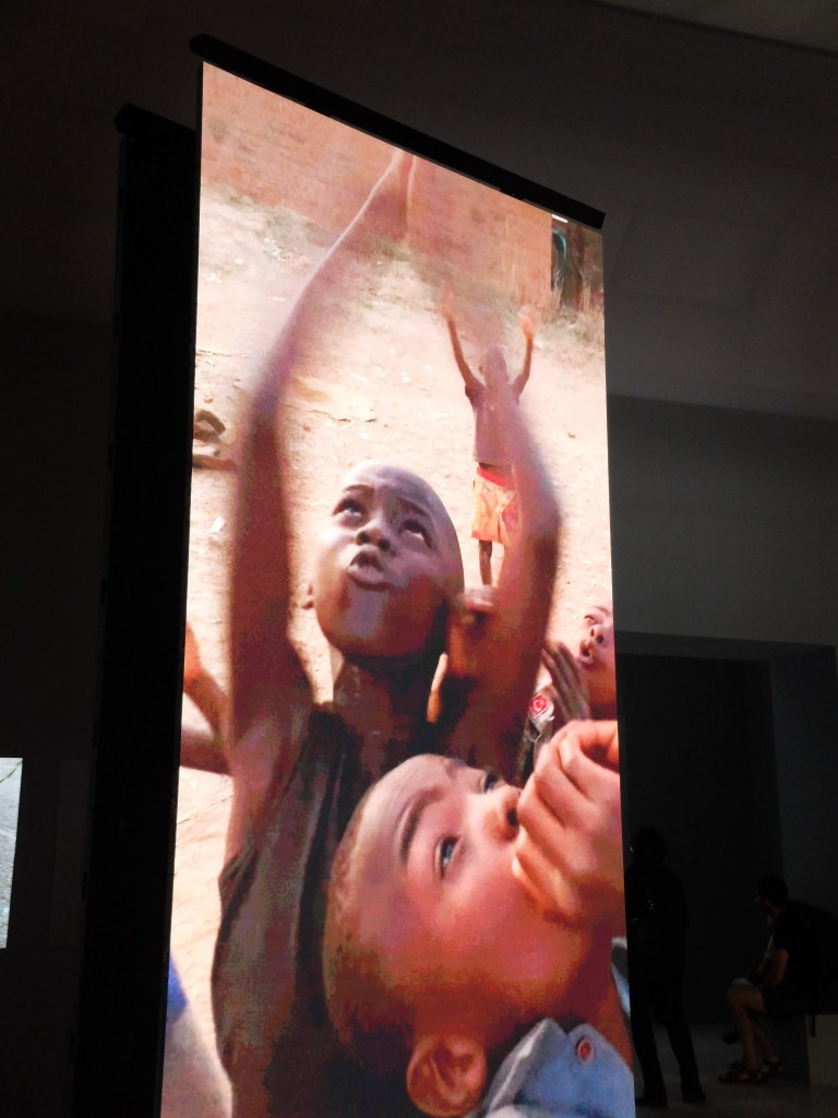 Au pavillon belge, des écrans montrent des jeux d’enfants dans le monde, des jeux simples avec des roues de camion à faire remonter sur des monticules, des jeux de pierres à lettre dans des trous, des courses d’escargot aux coquilles repeintes comme des voitures de sport, un drôle de jeu consistant à faire ensemble des ouh pour attirer des nuées de moustiques au dessus du groupe d’enfants puis à les écraser en tapant dans ses mains, un genre de chat perché sur des grosses pierres, des jeux de guerre où les fusils sont des miroirs et les balles les éclats de lumière qu’ils renvoient, et bien sûr des jeux de billes et des cordes à sauter… On est loin des jeux électroniques.