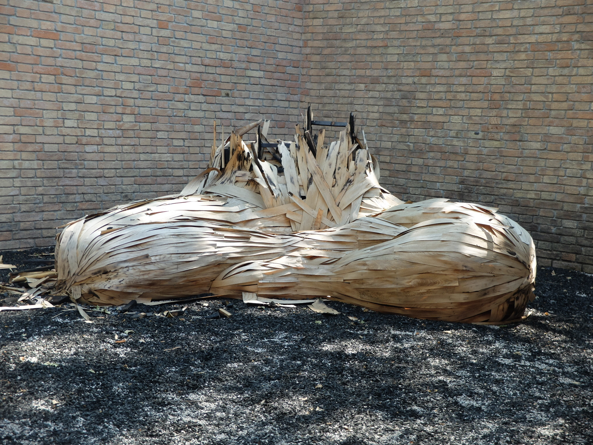 Le pavillon suisse : Latifa Echakhch présente une installation de sculptures éphémères en bois fin dont certaines ont été brûlés et dont il ne reste que les structures intérieures qui les supportaient.