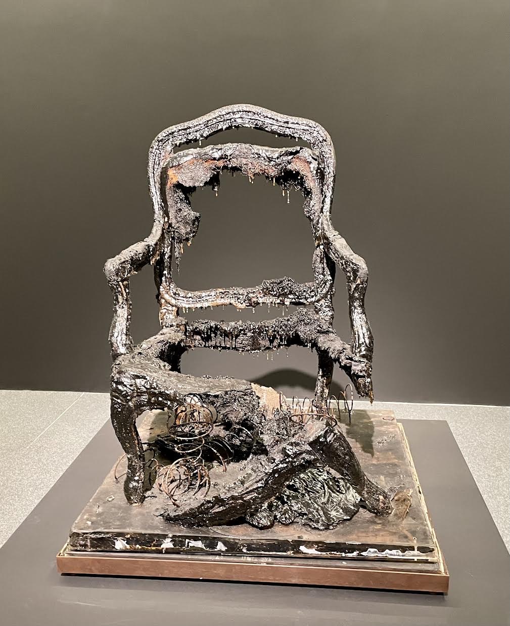 Arman brûlant des meubles en projetant de l’essence puis de l’eau pour arrêter la combustion et obtenir l’effet précis qu’il recherche