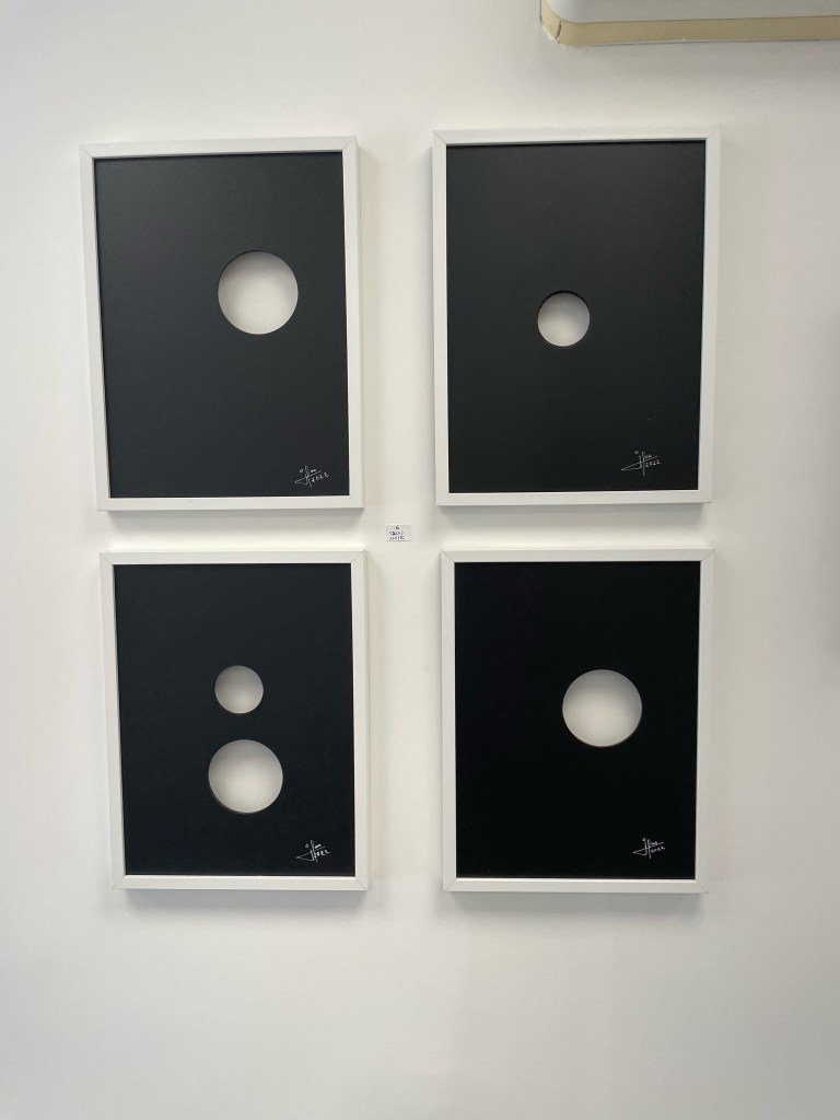 Mais Jean Mas a plus d’une corde à son Art (à son harpax ou son hapax). De l’intérieur des cages sont sortis les « Peu » (qui valent mieux que la multitude), les Ombres (à l’épaisseur intangible) les Bulles (qui emprisonnent l’ait dans leur fine membrane encrée), les Arts Combrants (dérangeant l’espace), et dernièrement, à l’occasion de l’exposition, des Trous (aux mystérieux trous noirs, il oppose les troublants trous blancs).