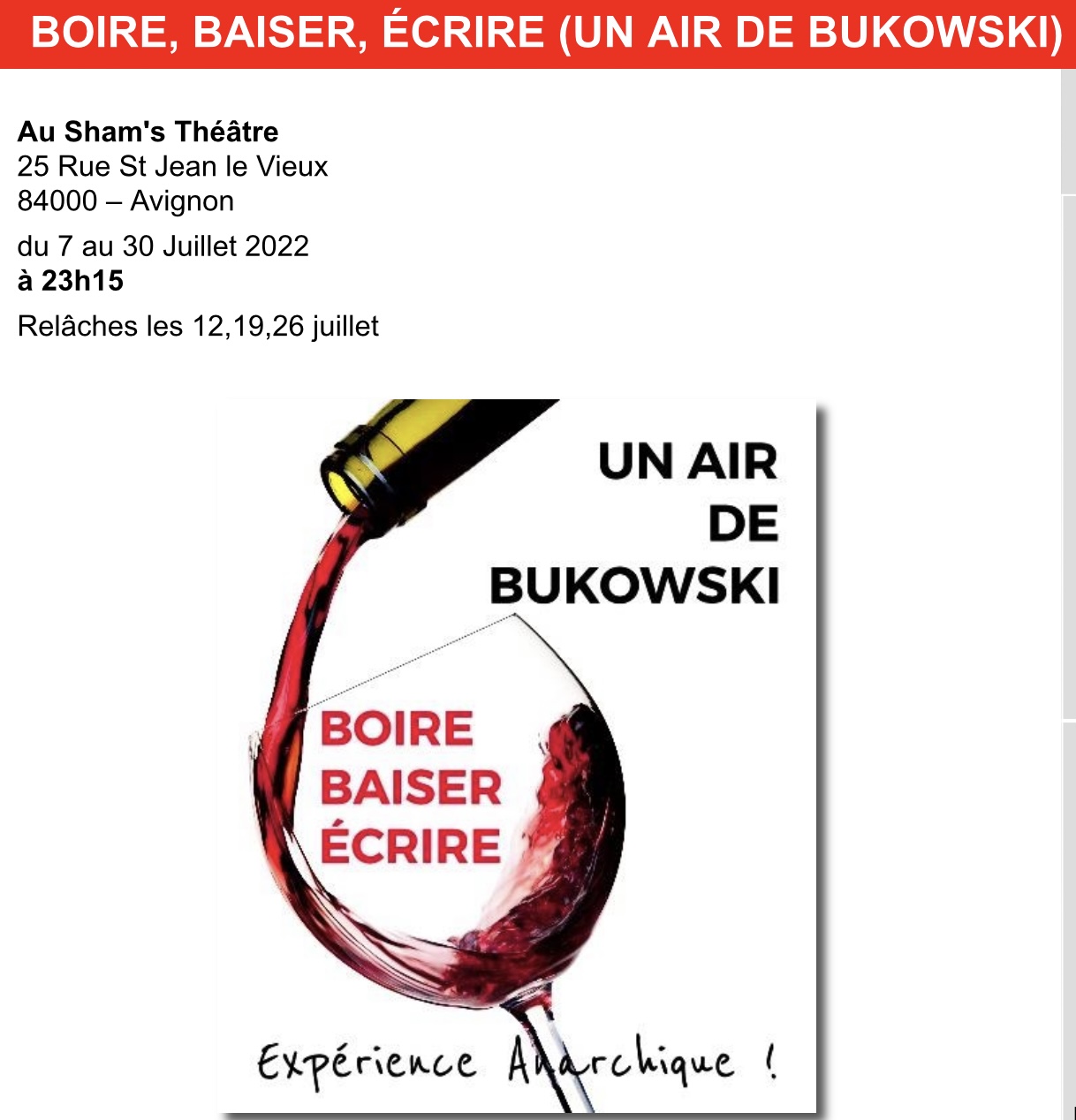 A la fin du « spectacle », après tout ce qu’il a bu tout en nous parlant (trois cannettes de bière, un demi-litre de vin rouge et quelques shots de whisky ou de cognac – j’ai compté), il s’assoit devant nous et commence un après-spectacle où il dialogue directement avec le public, où il explique ce qu’il fait, ce qu’il vient de faire ou fera – et on pourrait passer des heures avec lui à parler de Bukowski (qui n’est pas seulement celui qu’on a vu chez Pivot), de la vie, de l’écriture et de l’intime, mais le théâtre doit fermer et il faut bien s’arrêter.