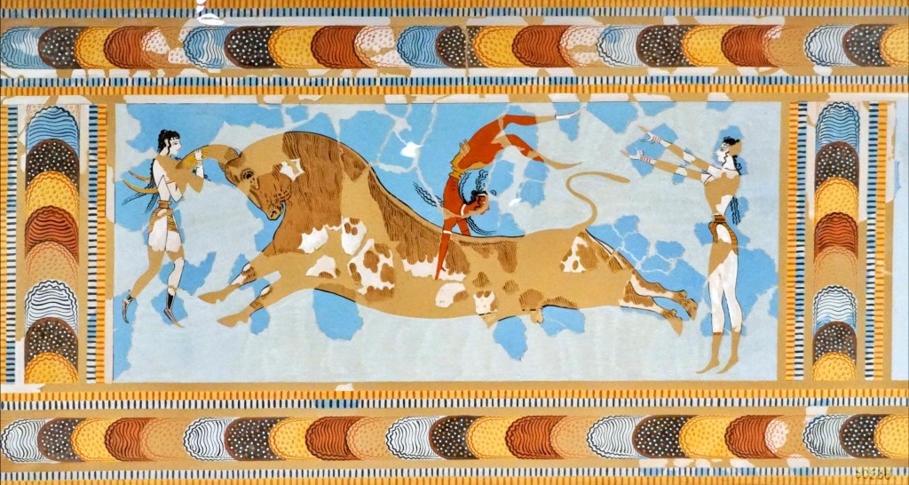 Ce qui est particulièrement étonnant, c’est la joie de vivre qui émane de leurs fresques qui montrent des jeux, des festins, des danses, des sports, notamment leurs jeux souvent représentés de femmes ou d’hommes faisant des acrobaties sur des taureaux. Dans leur art, tout est mouvement, tout le contraire des images figées et compassées de l’Egypte. Les animaux sont présentés avec bienveillance.