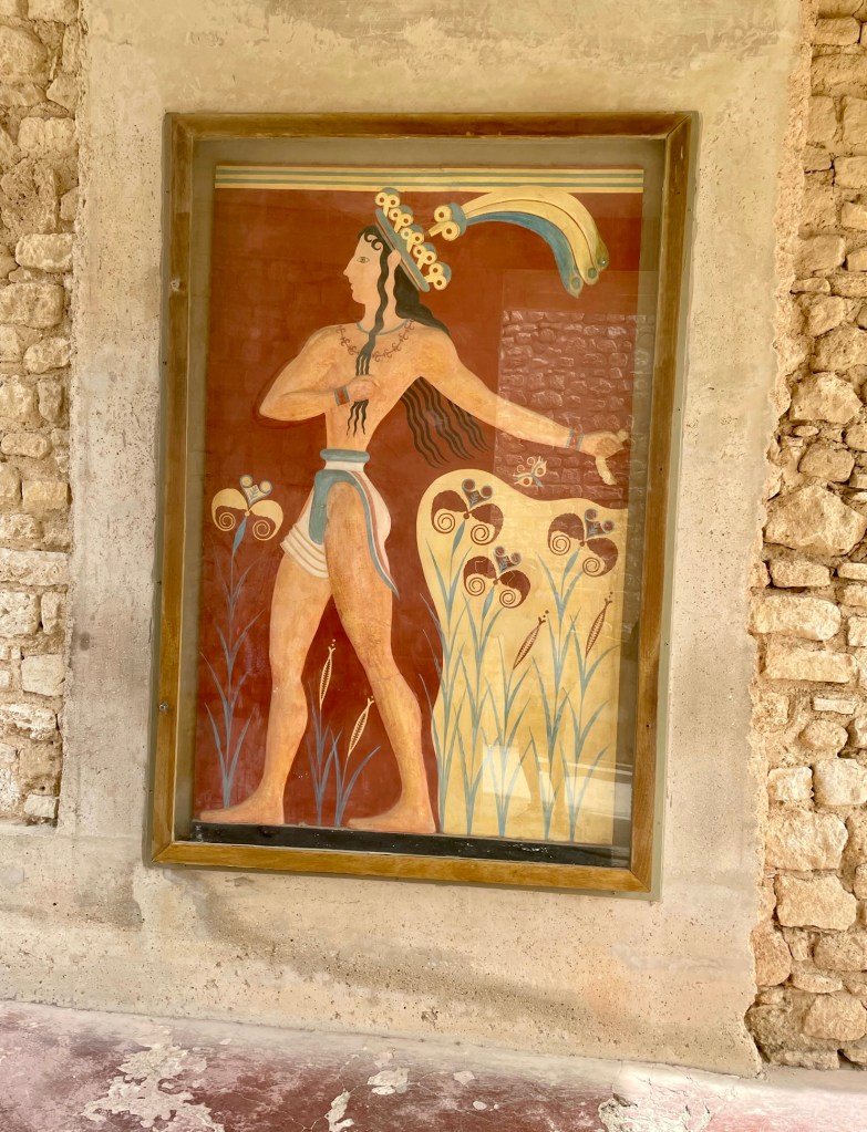 Dans toutes leurs représentations, il semble que les femmes étaient à l’égal des hommes. Dans les fresques, nous voyons des processions de porteurs et de porteuses d’offrandes. Leurs palais, installés au milieu de terres fertiles sont immmenses, sur plusieurs niveaux, abritant leur population et des magasins où des jarres immenses (de vin, d’huile, de céréales) sont entreposées. Les relations entre les chefs locaux semblent pacifiques et fondées sur la collaboration et la Crète a dû connaître une époque de paix et de prospérité qui a été mise à mal par des catastrophes (tremblements de terre de Santorin et d’autres), et par des envahisseurs qui ont saccagé leurs palais, et entraîné le déclin puis la mort de leur civilisation dont seul l’art a perduré (comme toujours).