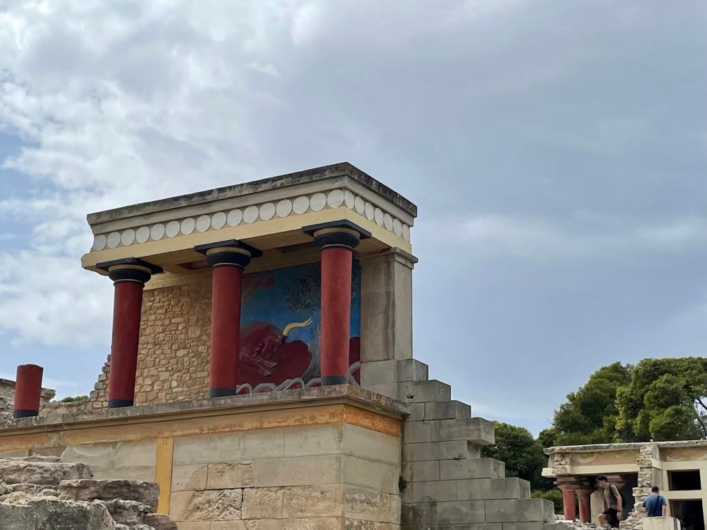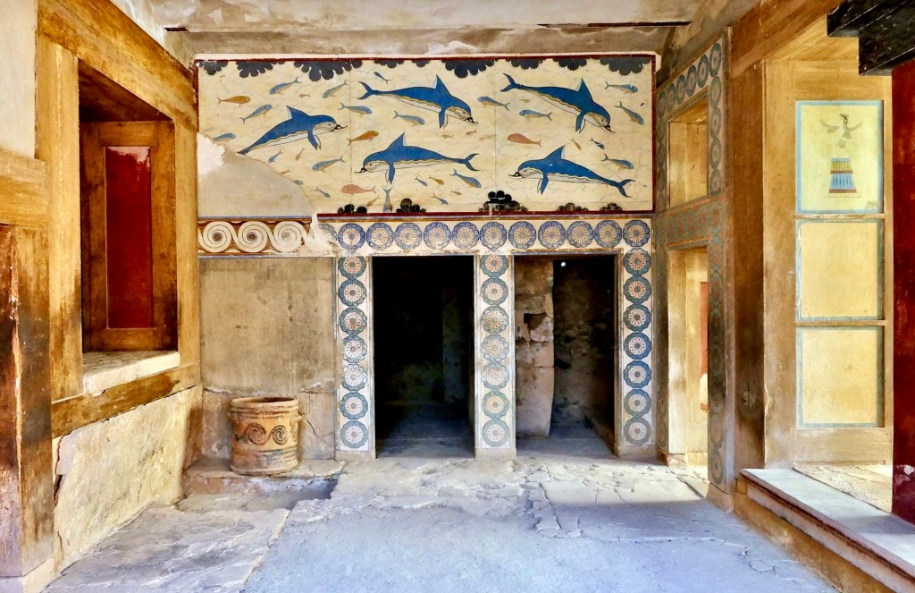 La salle du trône bien préservée montre le trône en pierre entouré d’une fresque représentant deux superbes griffons rouges. De très belles fresques sont présentes dans les salles : fresque des dauphins, du Prince aux Lys, des acrobaties sur un taureau, des processions, etc. Le taureau sacré très présent est un des symboles récurrents de la Crète. Des cornes géantes sont d’ailleurs présentes à l’entrée du Palais. On y voit également des femme verre à la main, des scènes de fête. Tout est en mouvement, renvoyant une image dynamique de bien être, de joie.