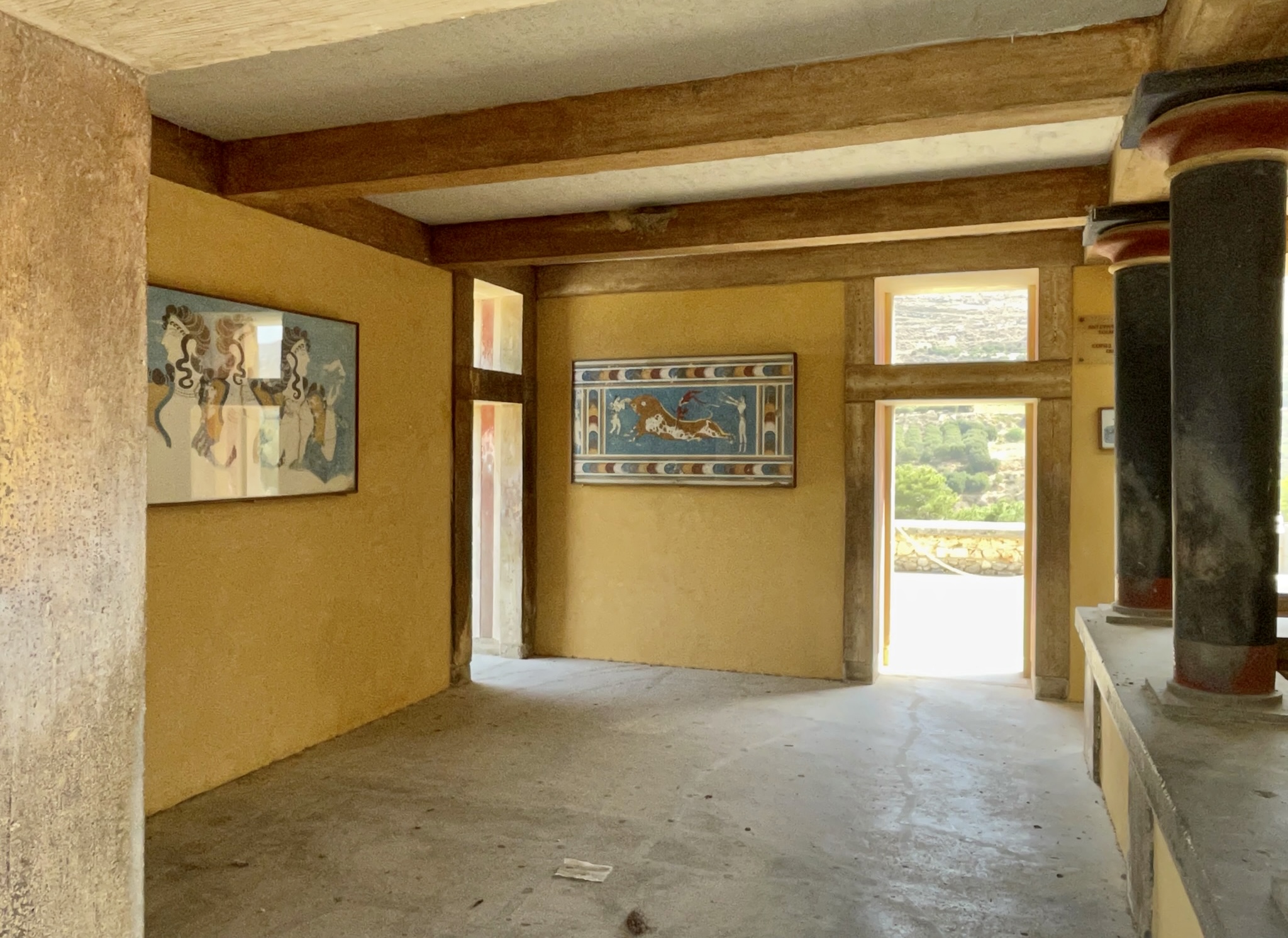 La salle du trône bien préservée montre le trône en pierre entouré d’une fresque représentant deux superbes griffons rouges. De très belles fresques sont présentes dans les salles : fresque des dauphins, du Prince aux Lys, des acrobaties sur un taureau, des processions, etc. Le taureau sacré très présent est un des symboles récurrents de la Crète. Des cornes géantes sont d’ailleurs présentes à l’entrée du Palais. On y voit également des femme verre à la main, des scènes de fête. Tout est en mouvement, renvoyant une image dynamique de bien être, de joie.