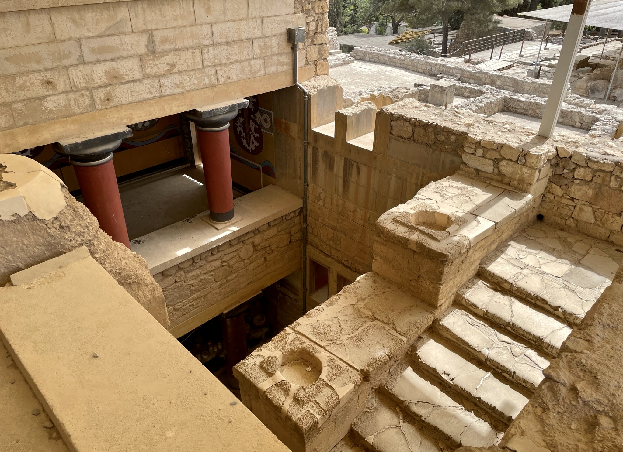 Centre administratif et religieux, la Palais comprenait d’immenses magasins remplis de grandes jarres décorées de motifs et hautes de deux mètres et plus qui devaient conserver l’huile, le vin, les céréales.