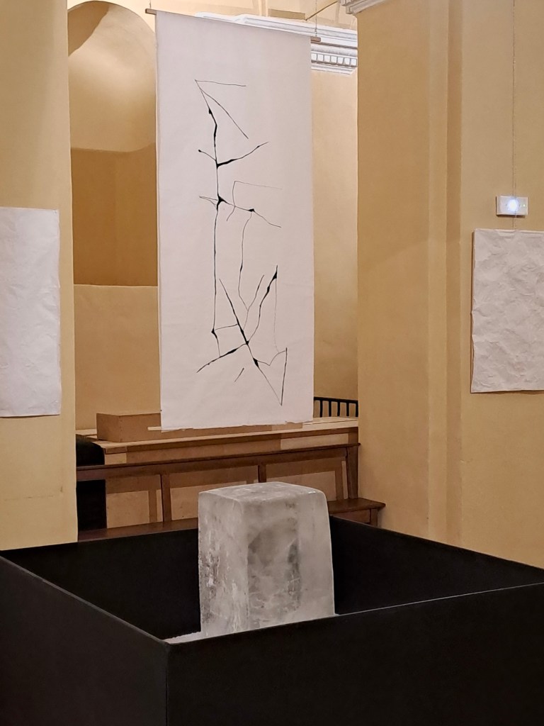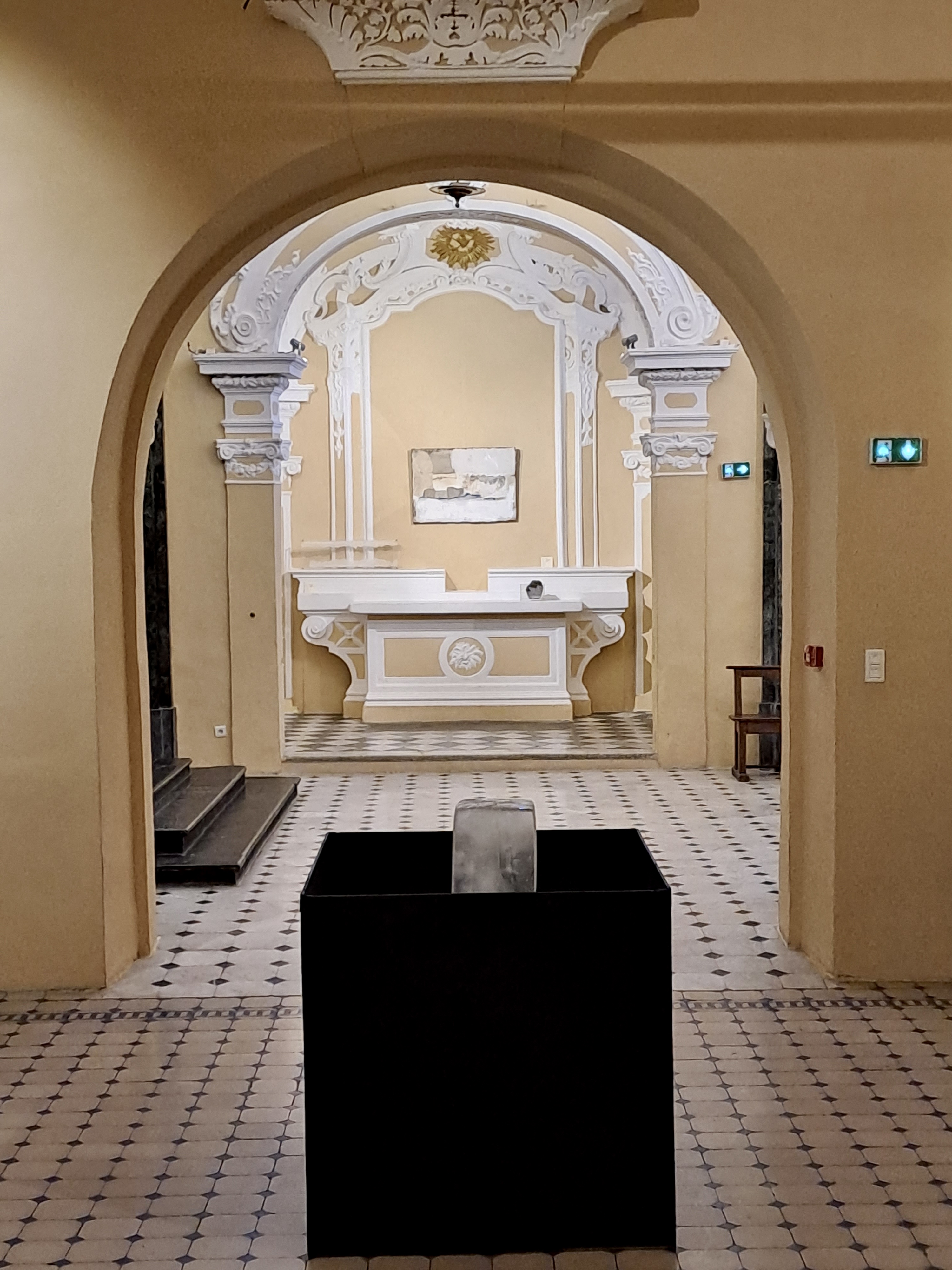 Un rappel de son travail sur la glace est présent sous la forme d’un bloc cubique fondant doucement dans un bac tapissé de sel..