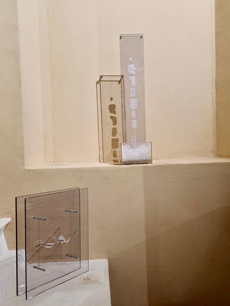 Plusieurs de ces empreintes sont présentées à l’exposition ainsi que des dépôts de sel fixés sous verre