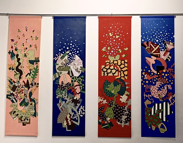 Chaque kakémono est différent, les fonds blancs, noirs ou dorés faisant vibrer différemment les couleurs. L’ensemble, qui doit probablement répondre à des émotions différentes selon les jours est gai, kchantant, dynamique.