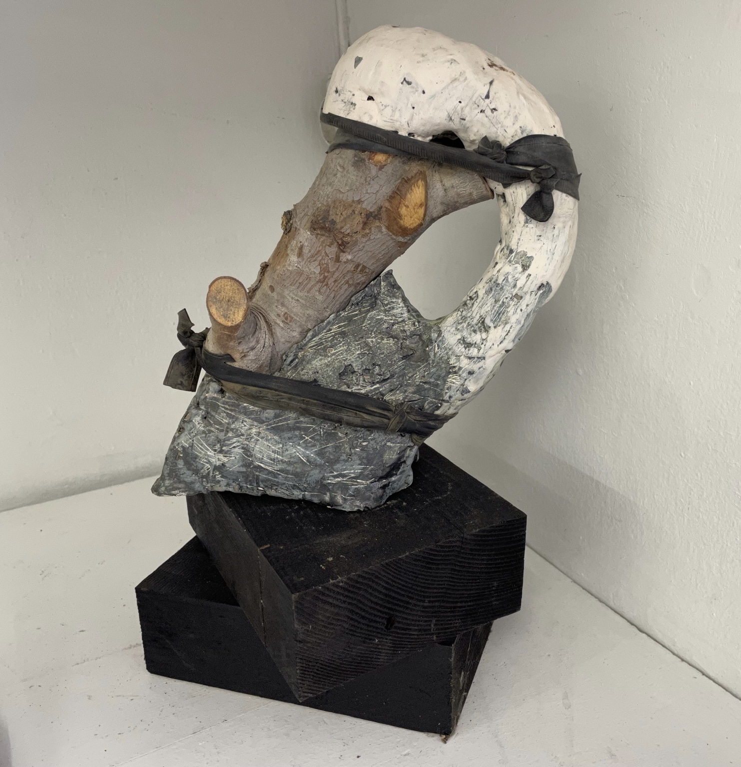 C’est ensuite que « la terre vient s’encastrer dans cette forme pour aller », nous dit l’artiste : « vers quelque chose que je ne connais pas ». Encore molle, elle est attachée, liée au support par des lanières de chambre à air, une pratique ancestrale des potiers pour faire tenir les formes.